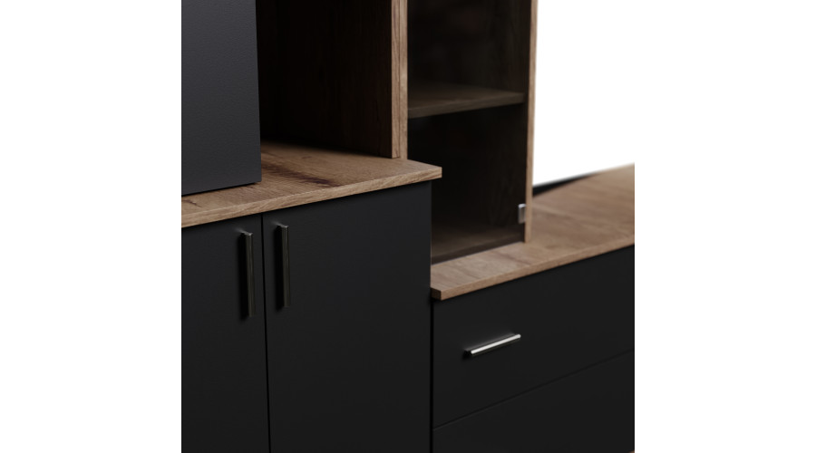 Erdvi sieninė spintelė su atviromis lentynomis, stalčiais ir spintelėmis, 340 × 220 cm, Dąb Lefkas / Czarny Onyx – MODENA