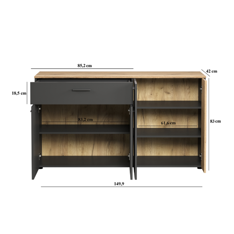 It features four spacious cabinets behind solid fronts and a practical drawer on full-extension ball-bearing slides, ensuring comfort and easy access to stored items. The furniture’s modern character is emphasized by subtle plastic handles and legs, while the contrasting color combination – graphite and evok oak – adds a unique style to the interior. Specifications:
