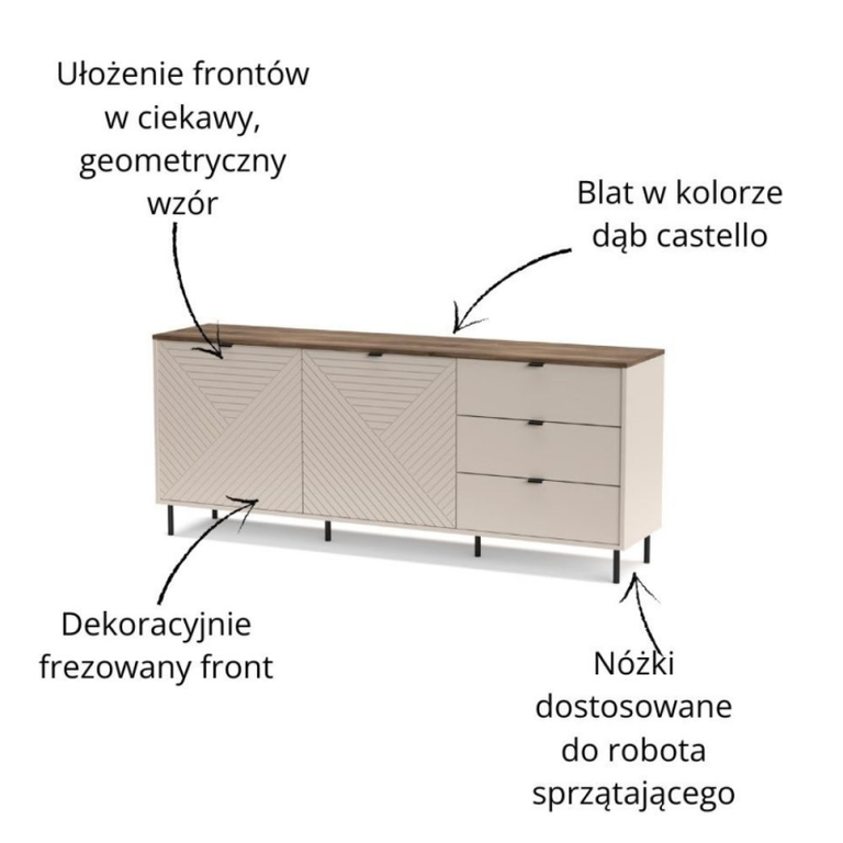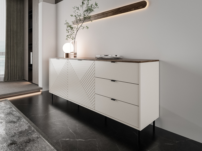 Looking for a piece of furniture that combines elegant design with practical solutions? The EVO 2d3s chest of drawers will meet your expectations! Its unique, geometric pattern on the fronts in a delicate cashmere shade gives your interior a subtle elegance and modern character. Decorative milling adds depth and makes the chest of drawers eye-catching.