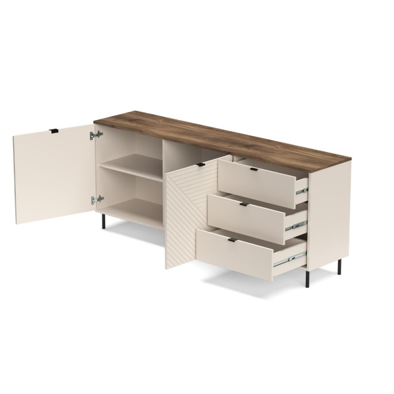 The top, made of high-quality Castello Oak board, adds a natural accent to the interior and perfectly complements the other elements of the furniture. The EVO chest of drawers is not only a beautiful decoration but also a practical storage solution. Spacious drawers and cabinets will accommodate all your essentials, keeping your home tidy.