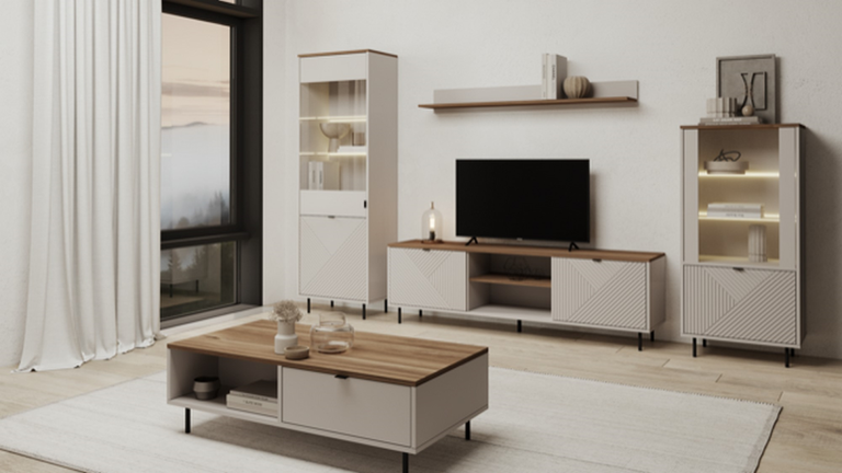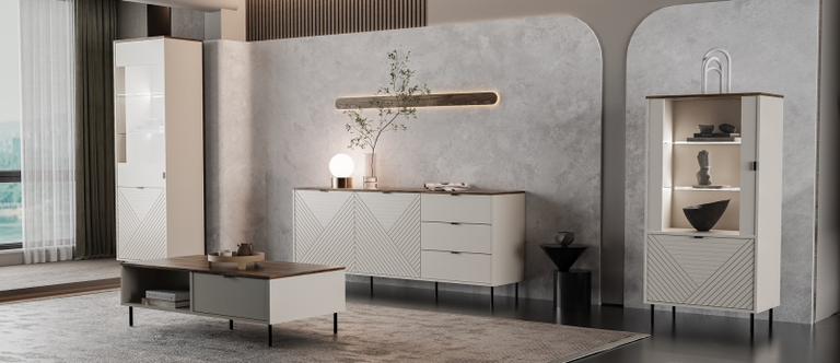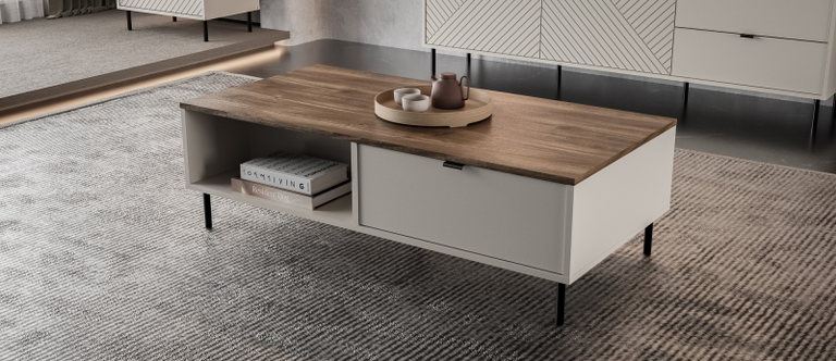 Dream of a living room where everything has its place? The EVO coffee table will meet your expectations! Its minimalist design, accentuated by a delicate shade of cashmere, fits perfectly into modern interiors. The Castello Oak top, imitating natural wood, adds warmth and coziness.