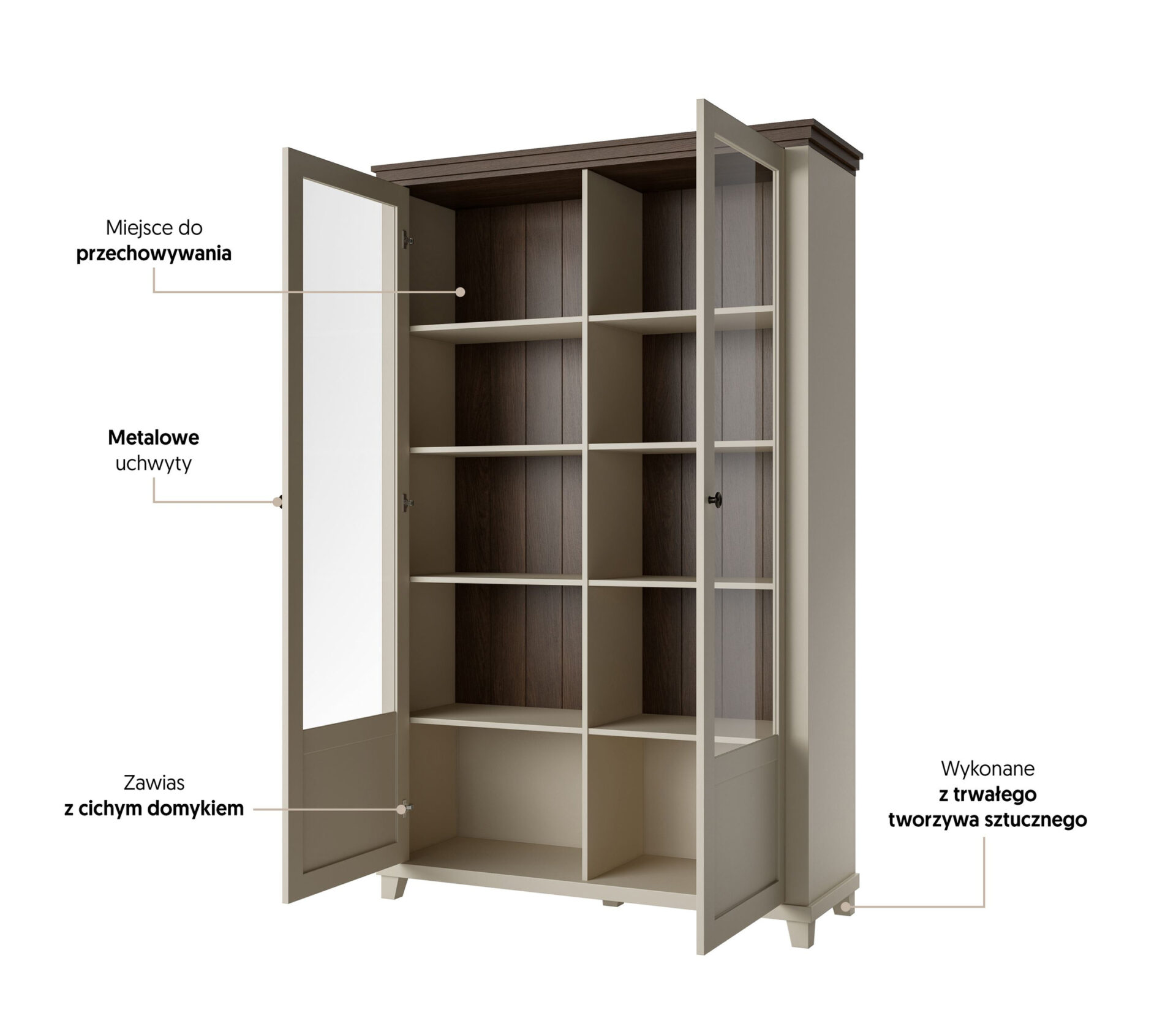 The Evora WM display cabinet is a perfect blend of elegance and functionality, perfectly complementing modern interior designs. Its subdued, light beige color combined with subtle Dunin oak details make it a perfect complement to a living room, dining room, or office. Regardless of your interior design style, the Evora display cabinet will bring a light and cozy atmosphere. Not only is its aesthetic appeal appealing, but also its practicality. The display cabinet features spacious shelves that will accommodate your favorite books, a collection of decorative cups, or family photos. Thanks to the soft-close system, you can be sure that each opening and closing of the cabinet will operate smoothly and silently, which will surely enhance the enjoyment of time spent with it. Thanks to its solid construction from high-quality materials, including laminated board and MDF, the Evora WM display cabinet is not only attractive but also extremely durable. Offering the assurance that it will withstand years of intensive use, combined with minimalistic matte black handles, it looks both modern and classic. The materials used are easy to clean, making the piece suitable for everyday use.