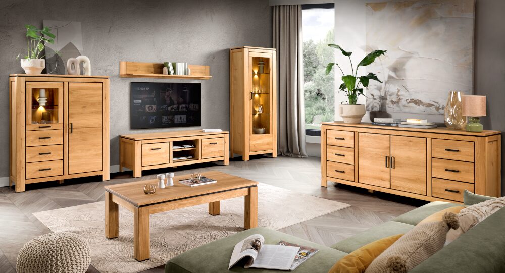 The Faro collection is available in two variants. The first is the classic Faro natural oak, valued for its simplicity yet elegance. The second variant, Faro II, features black accents such as handles, feet, and moldings, which add a modern touch of industrial style. This is the perfect option for those who want to emphasize the uniqueness and modernity of their interior.