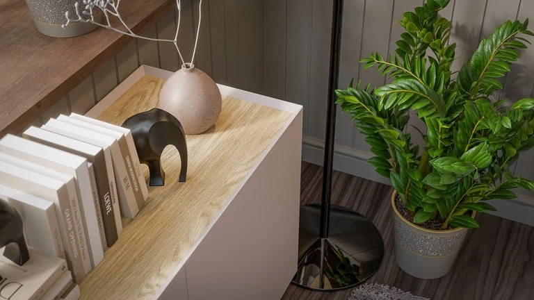 Top: Solid top in a natural oiled oak color, contrasting perfectly with the light fronts.