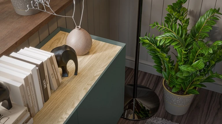 Top: Natural oiled oak – solid, durable, and beautifully contrasting with the olive fronts.