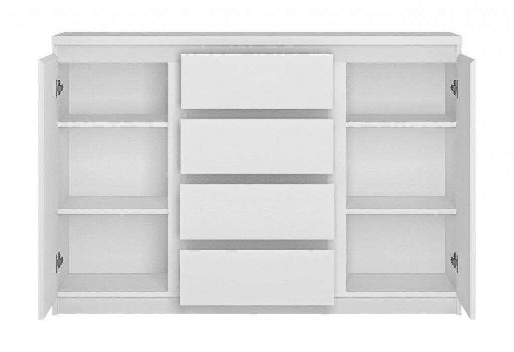 Discover the beauty of simplicity with the Fribo FRIK03 chest of drawers – an impressive addition to your home that combines elegance and functionality. This classic, snow-white 2D4S chest of drawers is perfect for those who value minimalism and a modern look. Exceptionally spacious, with a width of 135.4 cm, a height of 92.9 cm, and a depth of 40 cm, the Fribo chest of drawers provides ample space to organize all your essentials. It features two doors and four drawers on ball-bearing slides that guarantee full and smooth extension, allowing easy access to stored items. The modern and simple design of the chest of drawers complements other items from the Fribo collection, creating cohesive and harmonious arrangements. The handleless system adds elegance and ensures ease of use, while the timeless white color brightens the room and visually enlarges the space.