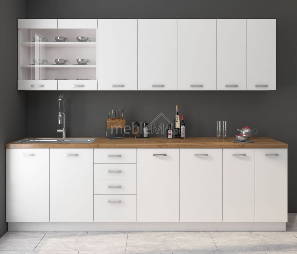 The Eco White kitchen is a set of highly practical and attractive furniture pieces that will complement any interior. Thanks to its glass display case, it will provide a decorative accent to the room, giving it a subtle and interesting look. Solid handles add character and facilitate access to products stored within.