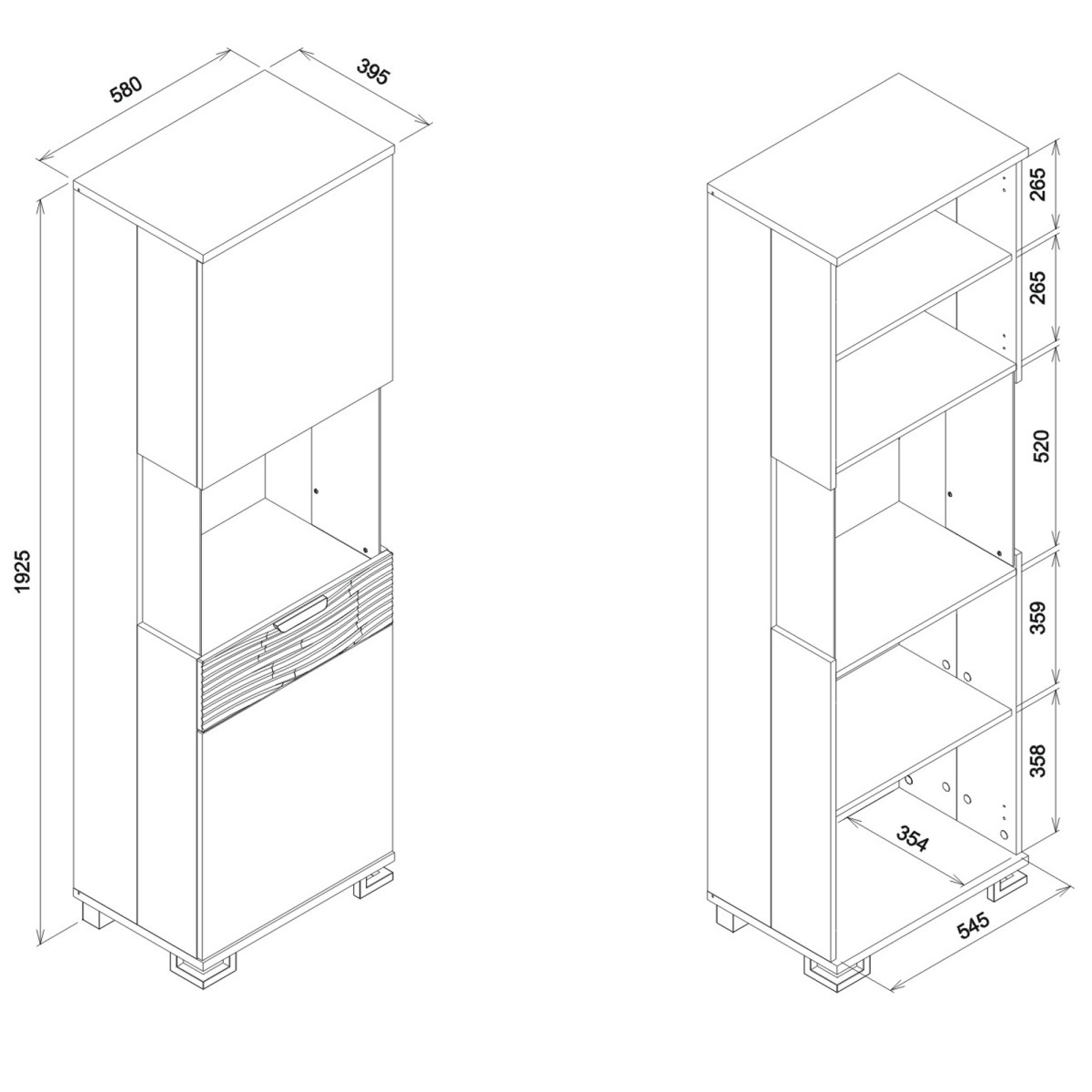 Width 58 cm Depth 39.5 cm Height 192.5 cm Style Modern Equipment Assembly instructions / assembly accessories Assembly For self-assembly