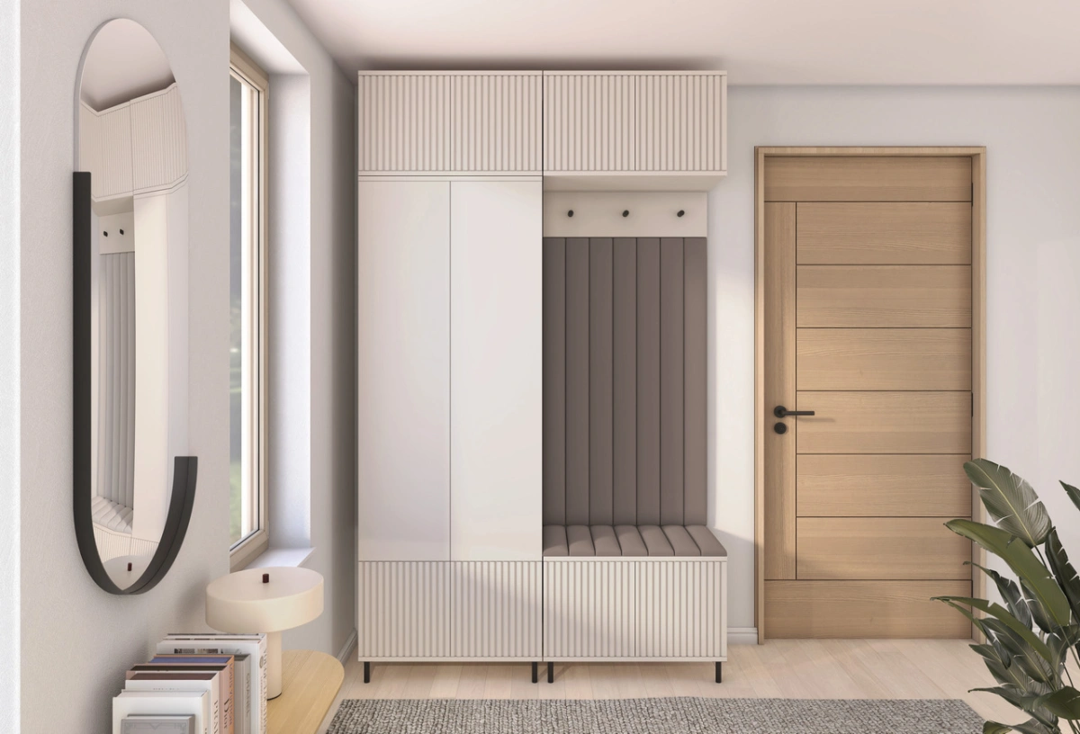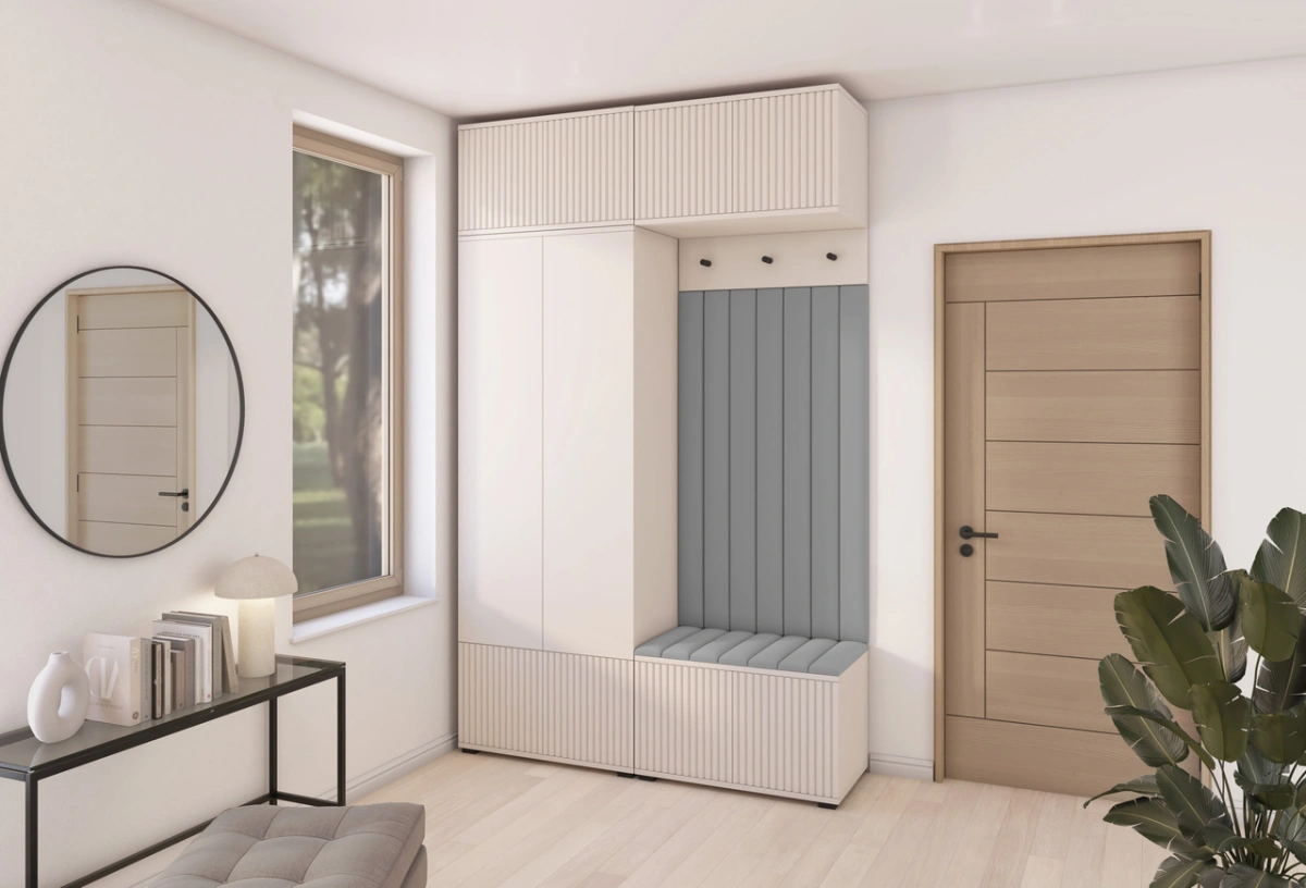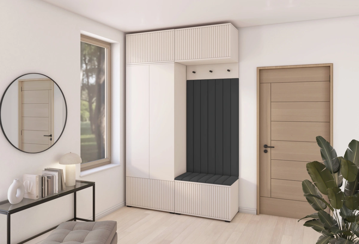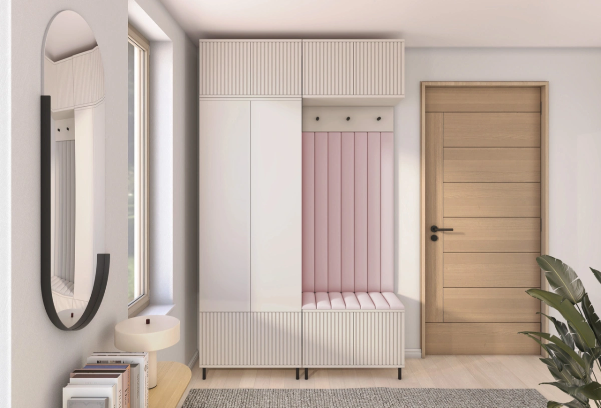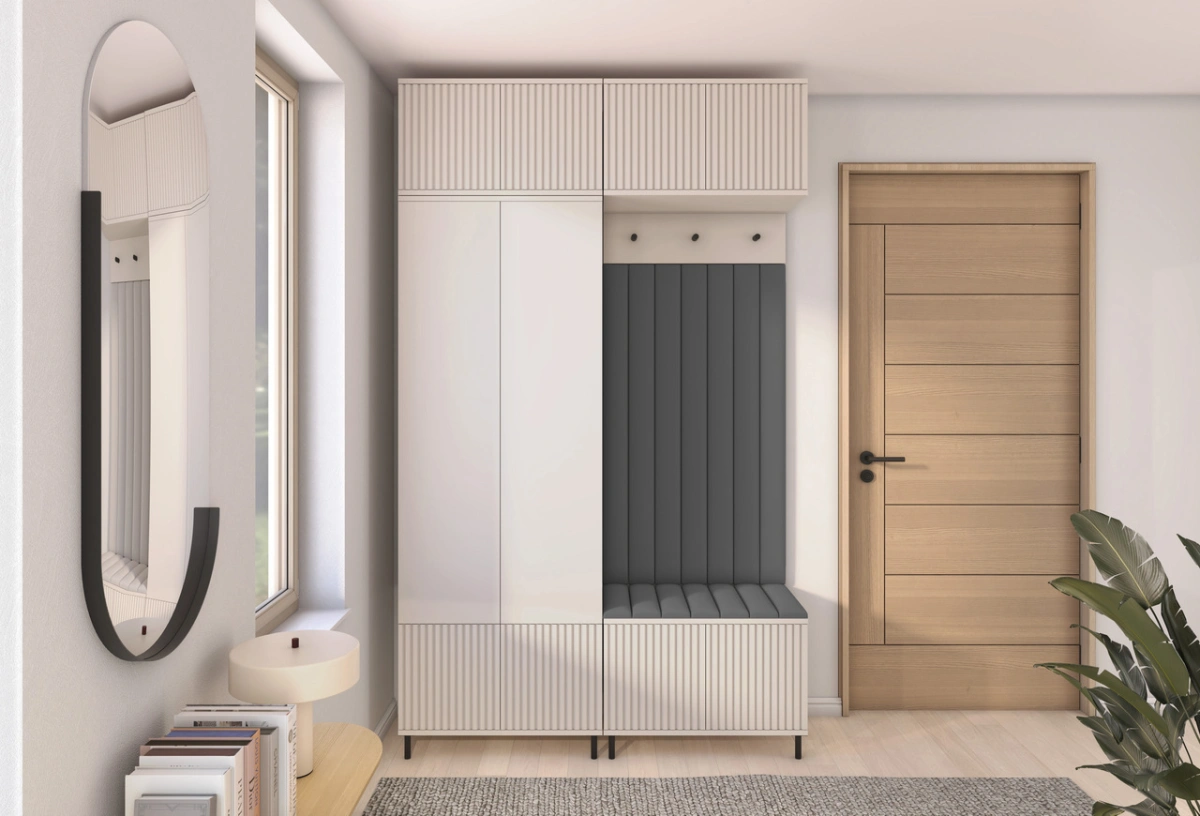 The Romeo 2 upholstered wardrobe includes a 70 cm wardrobe, 2 extension units, a 70 cm shoe cabinet, a coat rack with hooks, and upholstered panels: