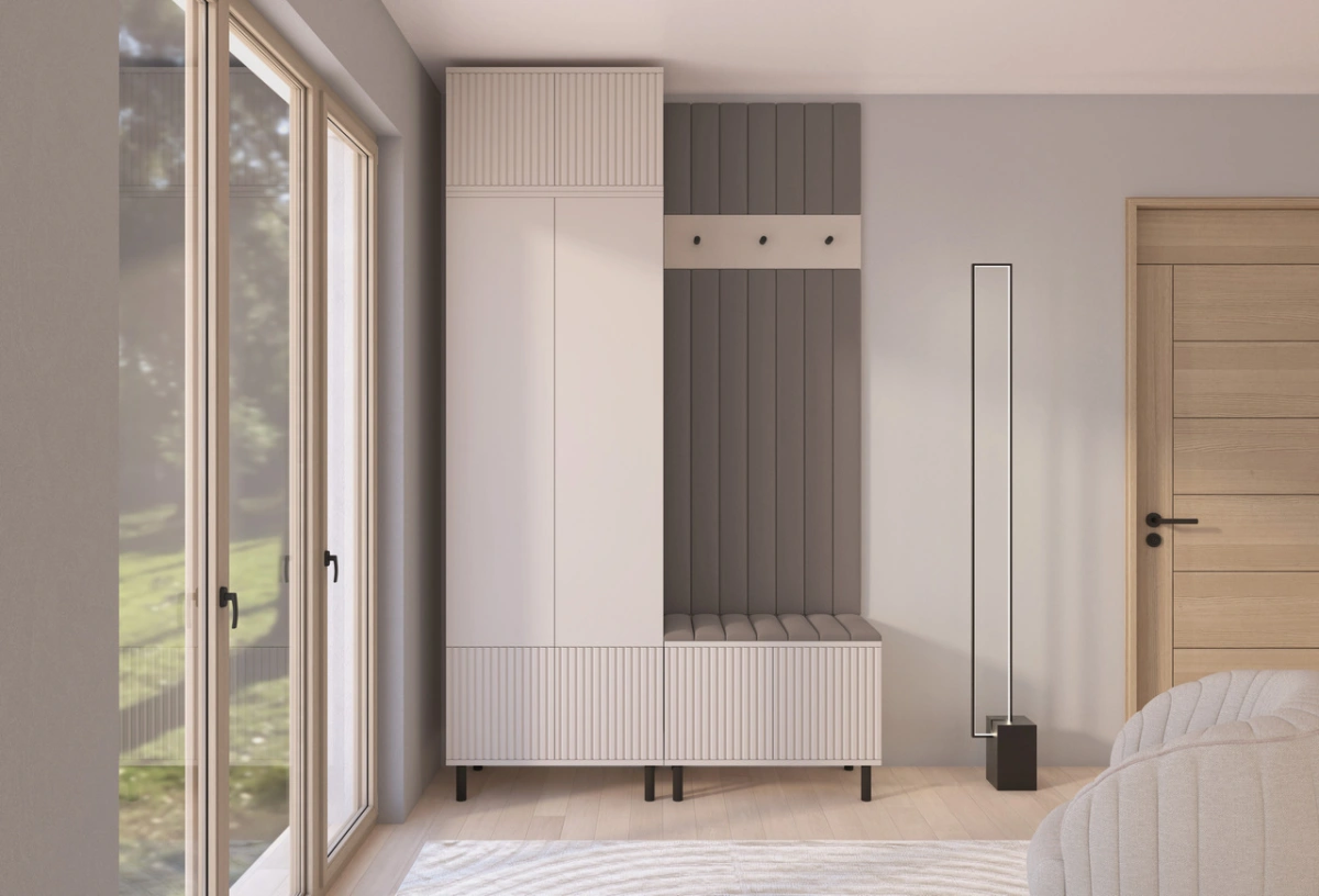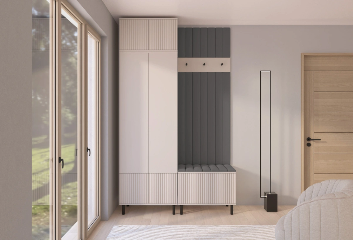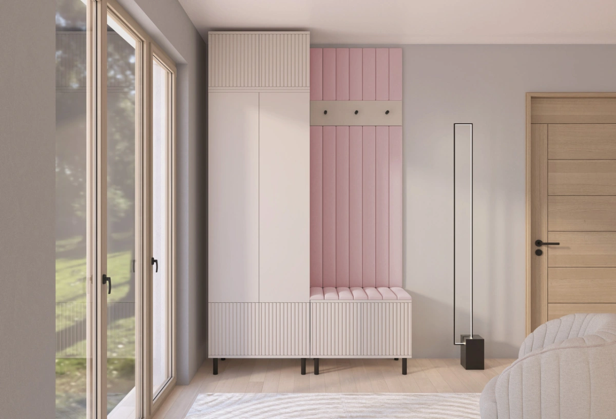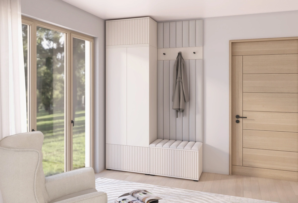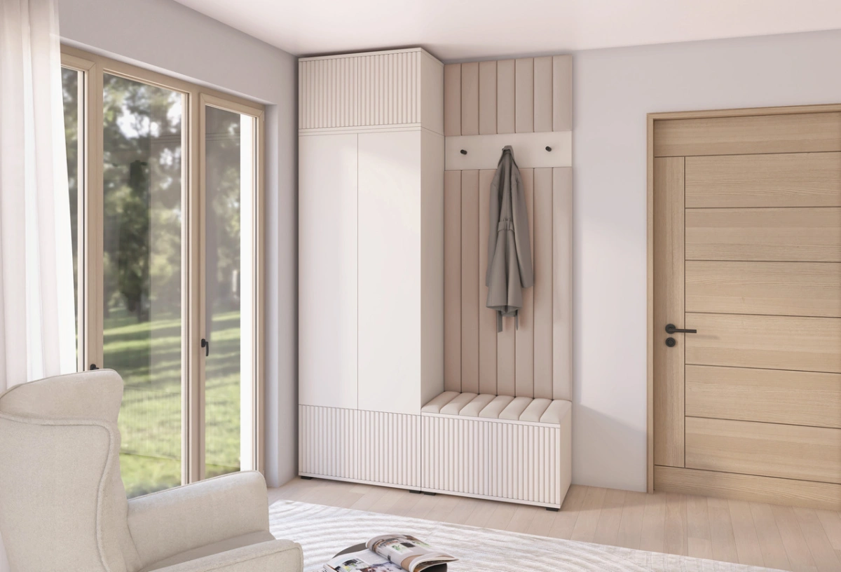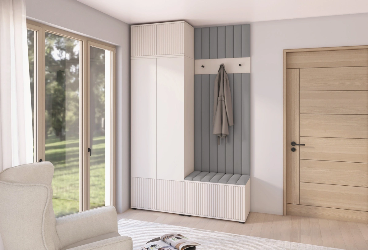 The Romeo 4 upholstered wardrobe includes a 70 cm wardrobe, a wardrobe extension, a 70 cm shoe cabinet, a coat rack with hooks, and upholstered panels:
