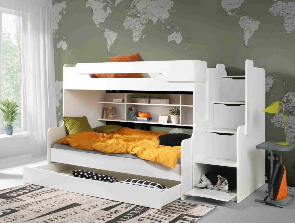 HARRY dviaukštė lova su lentynomis, 2 asmenims, balta 90×200 cm