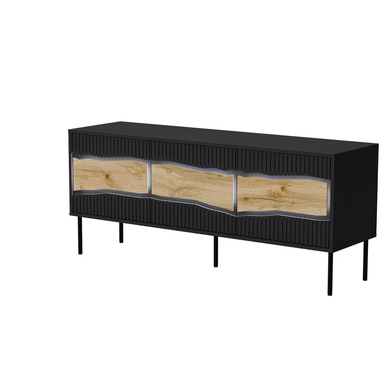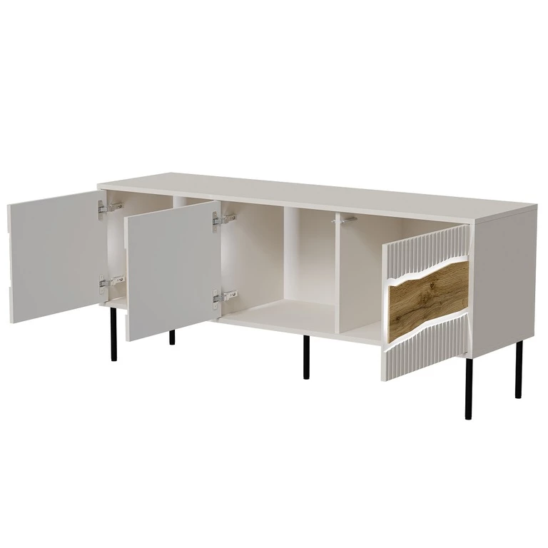 The cabinet’s fronts are made of MDF with visible milling, giving the furniture a unique character and emphasizing its modern style. Thanks to the push-to-open system, the cabinet is handleless, enhancing its aesthetics and ease of use. Metal legs add a lightweight feel and ensure stability.