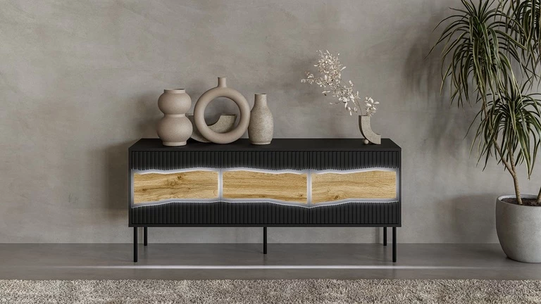 The INSERTO 3D TV cabinet is an elegant and modern piece of furniture distinguished by its unique design and high-quality workmanship. Available in two unique color options: cashmere combined with wotan and black combined with wotan, it fits perfectly into various interior designs – from minimalist to loft-style.