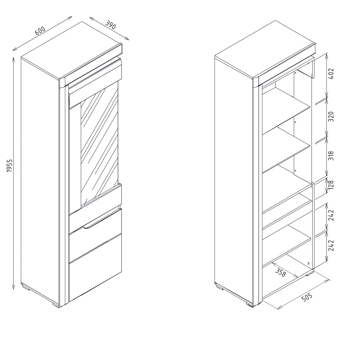 The IRMA IM06 left-hand display cabinet is an elegant, charming, and modern piece of furniture for both living rooms and lounges. This sleek, glass-fronted cabinet is perfect for spaces with a minimalist, understated design. The interior features numerous shelves that help organize your belongings. You can display family photos and elegant keepsakes on the illuminated glass shelves, while the remaining shelves are perfect for items you don’t want displayed. The cabinet features a soft-close door system and energy-efficient, cool white LED lighting on the top panel. The striking milling on the fronts, which replace traditional handles, emphasizes the overall design of the cabinet. The classic combination of matte and glossy white perfectly complements current trends, adding incredible charm and freshness to the cabinet, while the reflective light adds a touch of cool elegance to the interior. The standard cabinet comes in two colors: white and Maggia Oak, to choose from. The left display cabinet will work perfectly in combination with other pieces from the IRMA series or as a single piece of furniture that can be adapted to your own room arrangement.