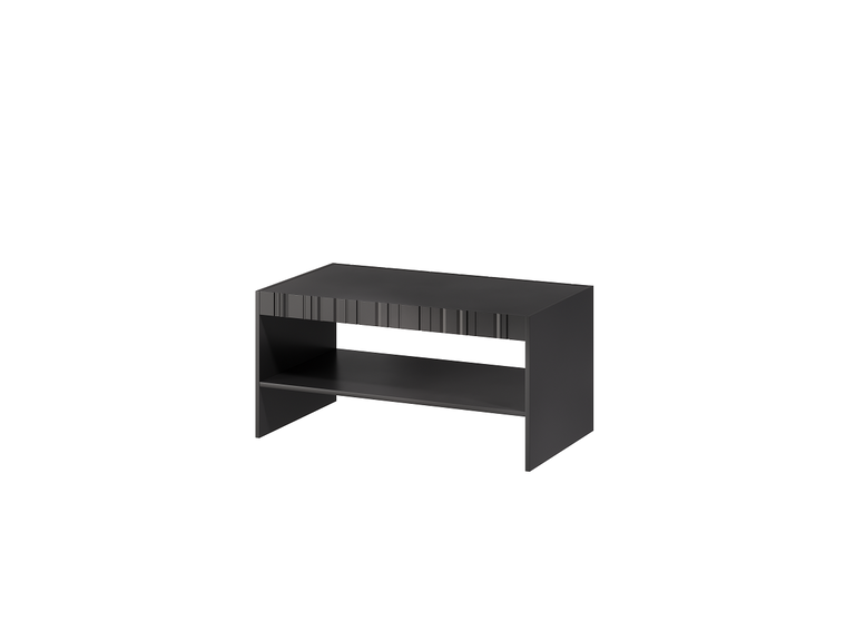 This rectangular coffee table with an elegant black finish combines modern style with functionality. A distinctive feature is the subtle, decorative grooves on the sides, which add a refined touch. The practical lower shelf provides additional space for books, magazines, and knick-knacks, keeping the tabletop tidy. The simple design and dark colors make the coffee table a perfect fit for living rooms in modern, industrial, or classic styles.