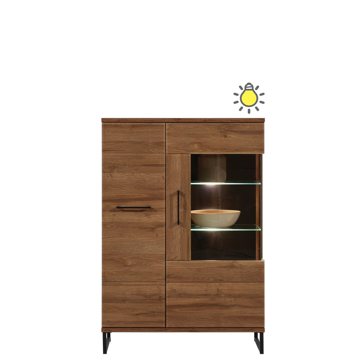 The IVO IV01 TV stand is an elegant and modern TV stand that will look great in a living room or den. The stand features two lockable compartments, one drawer, and an open shelf, creating ample storage space for essential items. The large surface area allows for a TV or decorative display. The geometric pattern on the front, black handles, and striking wood grain combine classic elegance with a touch of industrial style. The entire unit sits on distinctive black legs, which not only emphasize the cabinet’s elegant finish but also lend it a light feel. The TV stand is perfect for pairing with other pieces from the IVO series or as a standalone piece, adapting to your room’s décor.
