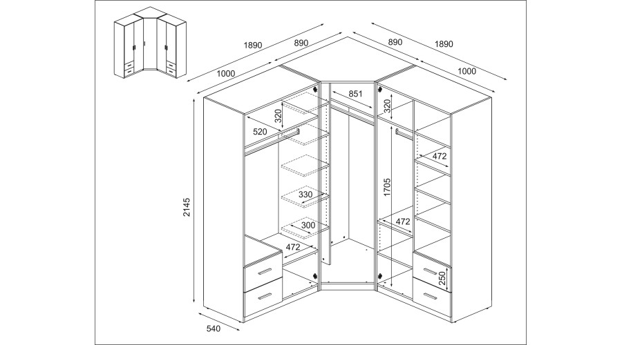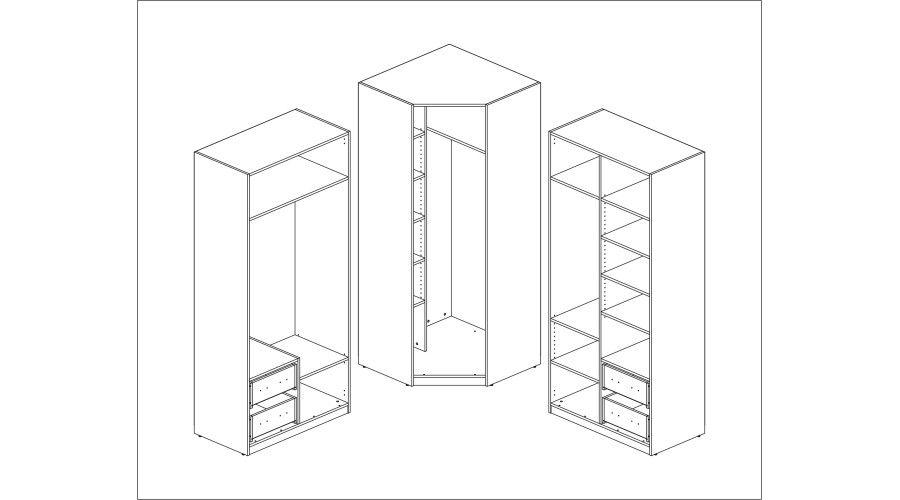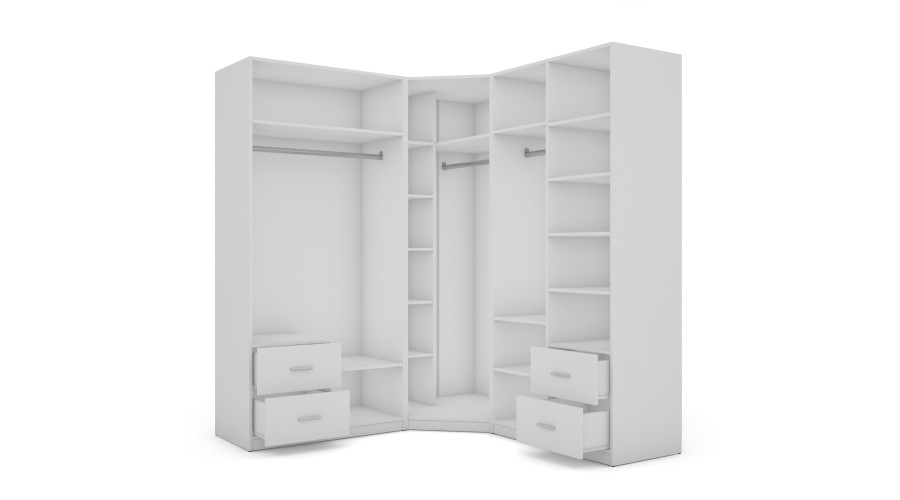 Kampinė spinta 189/214 – pakabinimo bėgeliai, erdvūs stalčiai, lentynos