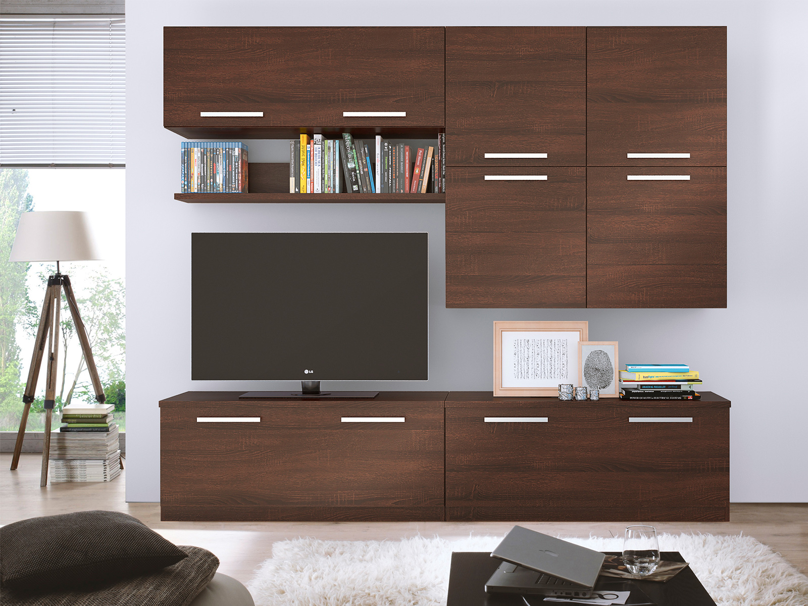 – The wall unit shown in the visualization is available in the color: Sonoma