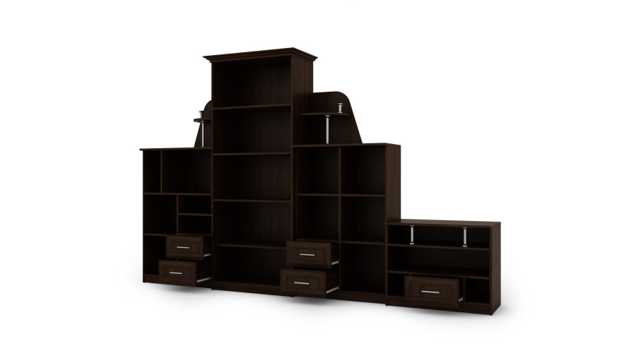 The TEXAS + RTV wall unit is a classic wall unit designed to combine display, storage, and multimedia areas in one cohesive unit. A large, glass-fronted display case serves as the centerpiece of the unit and allows for the aesthetic display of glassware, decorations, or collections, while maintaining the overall structure’s orderly and presentable character. A bar and a linen cabinet complete the system, enhancing the unit’s functionality in everyday use.