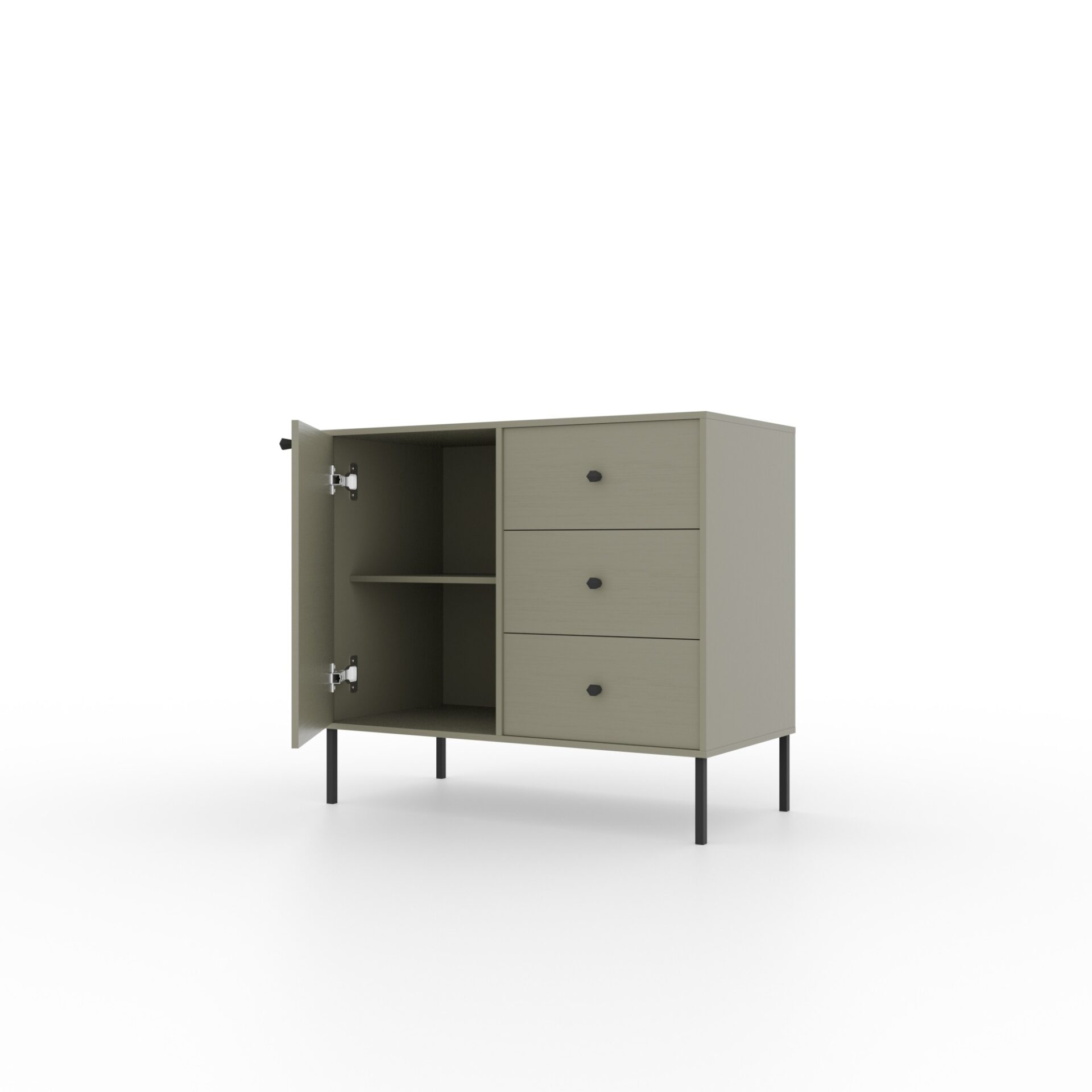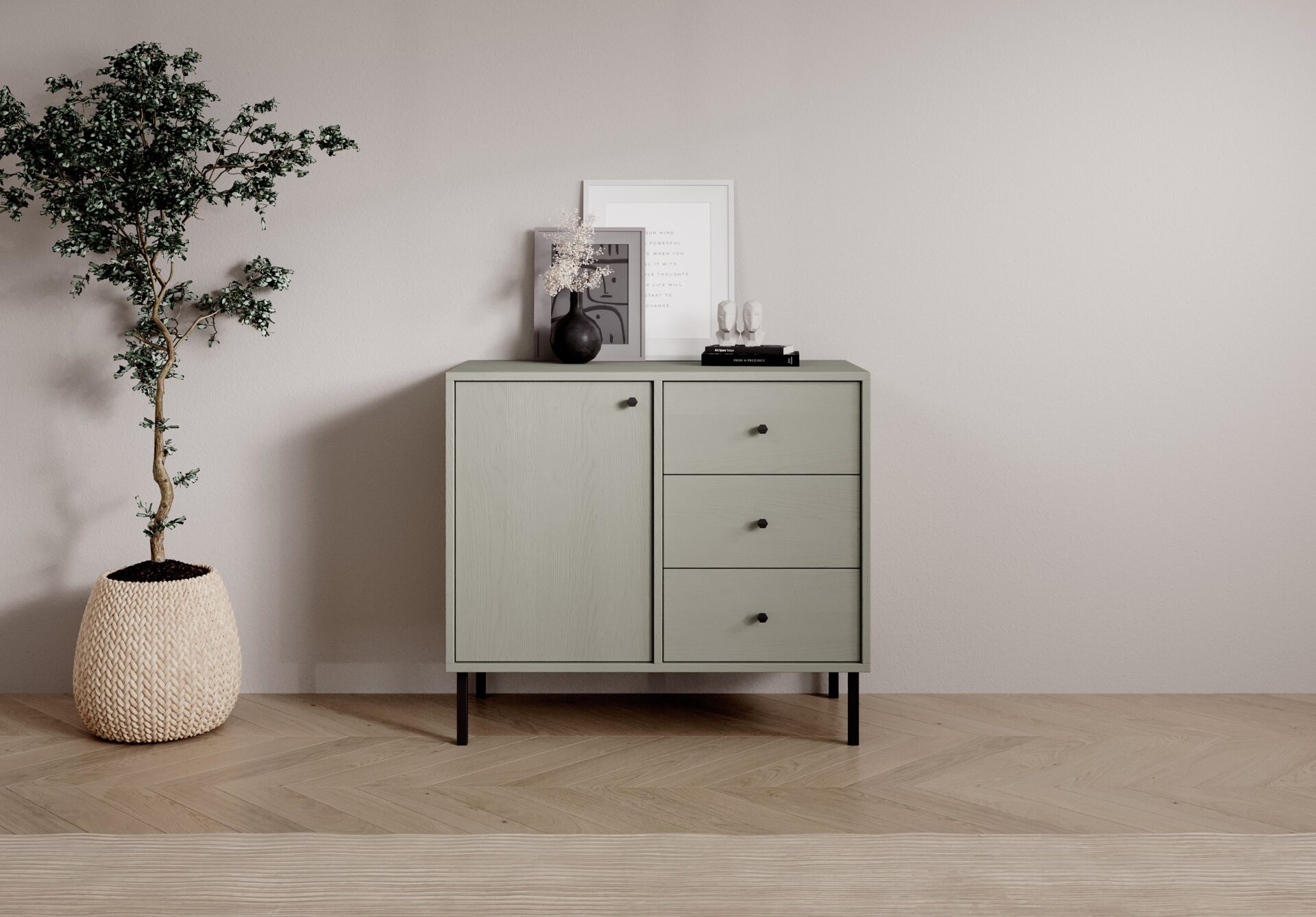 The Tili System Chest of Drawers is a modern piece of furniture that blends seamlessly into a variety of interiors thanks to its well-thought-out color palette and elegant design. Available in three color options: **black**, **sand beige**, and **eucalyptus**, the chest of drawers offers a harmonious blend of functionality and aesthetics. Each color has been carefully designed to emphasize the unique character of the interior. **black** gives the chest of drawers a refined, modern look, ideal for minimalist and elegant spaces. **sand beige** introduces warmth and subtlety, perfectly complementing light, natural décor elements. **eucalyptus**, on the other hand, is a shade inspired by nature, bringing freshness and lightness to the interior, perfect for both modern and more classic designs.