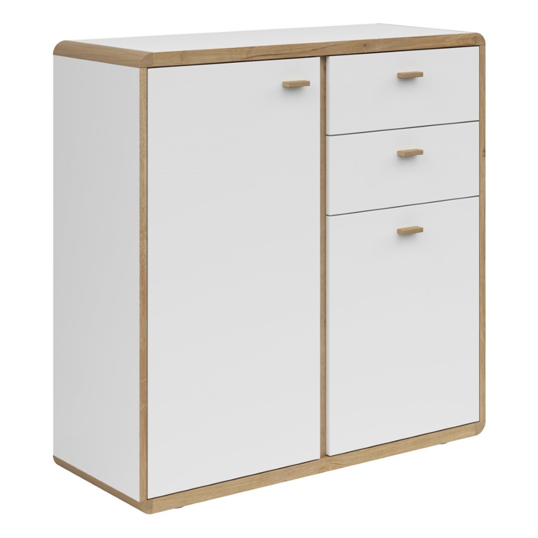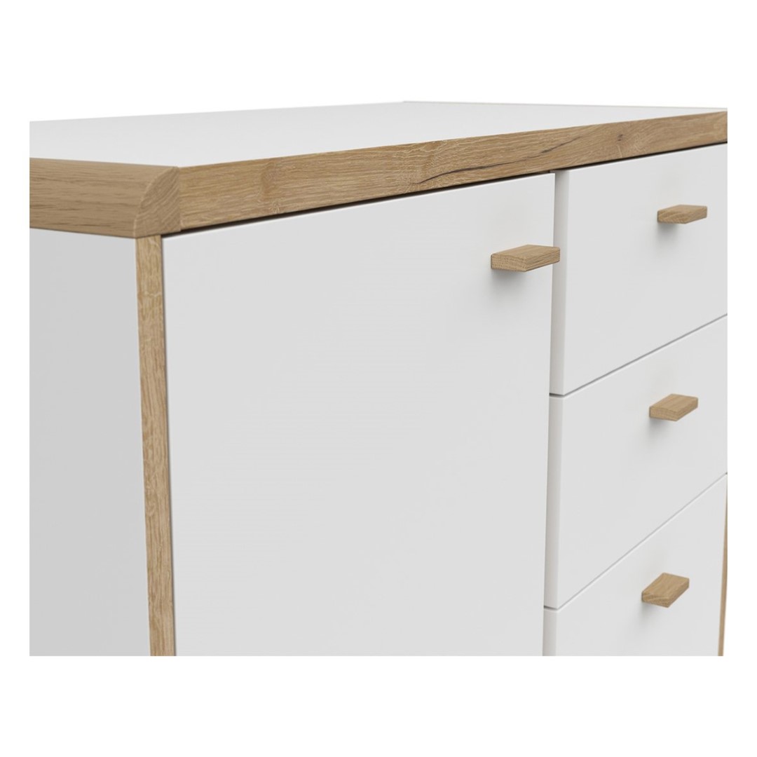 Ronda Chest of Drawers – Elegance in the Details The Ronda Chest of Drawers combines functionality, elegance, and meticulous craftsmanship, creating a piece of furniture that perfectly complements modern interiors. Let’s move on to the unique features of this chest of drawers: 1. Body: 16mm Chipboard / Matte White / Light Flagstaff Oak Interior – The harmonious color combination gives the chest of drawers a modern character while maintaining a subtle elegance. 2. Front: 16mm Chipboard / Matte White – The matte white front adds a modern touch to the chest of drawers and makes it a perfect match for a variety of interior designs. 3. Top: 28mm Chipboard / Corner Strips in a Solid Oak Body – The sturdy solid oak top gives the chest of drawers a unique character and adds a natural element to its design. 4. 2 Hinged Fronts – A practical solution that allows easy access to the chest of drawers’ interior without having to open it all the way. 5. 2 drawers (soft-close) – daily use of the chest of drawers is smooth and noiseless, which is always appreciated. 6. 3 shelves – functional storage spaces, allowing you to display various items and maintain order. 7. Wooden handles – wooden details add character and warmth to the chest of drawers, creating a cohesive whole with the corner strips. The Ronda chest of drawers is not just a storage unit; it’s a decorative element that easily integrates into various interior designs. Its meticulous craftsmanship and elegant design will make it a focal point in any room, adding a unique character.