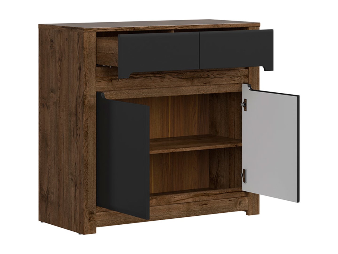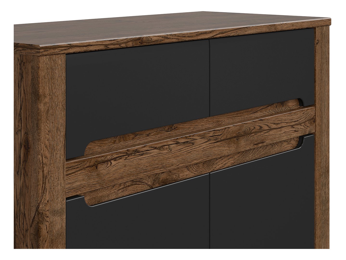 The Ruso Chest of Drawers – A Combination of Elegance and Functionality. The Ruso collection harmoniously combines classic style inspiration with modern elements. Within this collection, the Ruso chest of drawers stands out as a piece of furniture that is both compact and elegant. Here’s why it’s worth considering: The Ruso chest of drawers is the perfect solution when you need practical storage but are limited in space. It features two compact drawers and two doors, allowing you to organize a variety of items, from clothes to home accessories. The chest of drawers is crafted from wood in a deep shade of April oak, giving the piece a natural and warm character. This finish complements the matte black fronts, creating a beautiful contrast. Instead of traditional handles, the Ruso chest of drawers features recesses in the fronts that function as unique pulls. This subtle finish gives the piece a unique character and elegance. The dresser features striking plinths that not only add decorative detail but also emphasize the elegance of the piece. The dresser comes with a lava matte strip that can be installed in the recesses of the fronts. This detail enhances the aesthetics of the piece and gives it a unique look. The dresser’s guides and hinges are equipped with a soft-close mechanism, meaning the doors and drawers close gently and silently. This solution increases comfort and adds a higher quality to the piece. The Ruso dresser coordinates perfectly with other elements of the Ruso collection. This allows you to create a cohesive and elegant living room arrangement that reflects your taste and style. In short, the Ruso dresser is a piece of furniture that combines elegance and functionality. Its unique design, high-quality workmanship, and practical solutions make it an excellent choice for your living room or bedroom. By combining it with other elements of the Ruso collection, you can create a coherent and harmonious space that will not only delight the eye but also meet your storage needs.