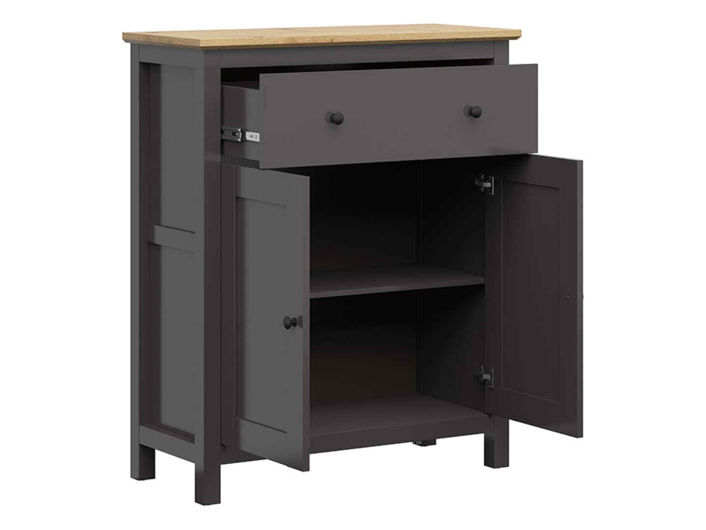 Hesen Chest of Drawers – A Perfect Combination of Minimalist Design and Functionality. If you dream of furniture that combines simplicity, elegance, and functionality, the Hesen collection is perfect for you. Its balanced design brings peace and order to your space, which can be beneficial for both studying and relaxing. Furniture from this series is a perfect fit for both a teenager’s room and a bedroom, offering not only practicality but also an inspiring aesthetic. The Hesen chest of drawers is available in two color options, allowing you to choose the one that best suits your preferences and interior design. The first option combines graphite with artisan oak, creating a modern contrast between the muted color and the natural wood grain. The second option is light Sibiu larch and Larico pine, which immediately evoke Scandinavian style. The Hesen chest of drawers measures 101 x 121 x 44 cm and offers practical storage solutions. It features one drawer mounted on a full-extension slide, allowing easy access to its contents, even in the most remote corners. Additionally, the chest of drawers has two soft-close doors, making the shelves silent and unobtrusive to family members while working, studying, or relaxing. Thanks to the chest of drawers’ ample interior space, you can store clothes, towels, or bedding, and display decorations and accessories on its top that will enhance the room’s character and introduce your favorite colors. The Hesen chest of drawers is not only a practical storage solution but also a decorative element that will add cohesion and harmony to your interior. It’s perfect for a teenager’s room, bedroom, or living room. If you want to create a cohesive arrangement, consider other elements from the Hesen collection to create an interior that will delight with its simplicity and functionality. Let the Hesen chest of drawers help you maintain order and harmony in your home.