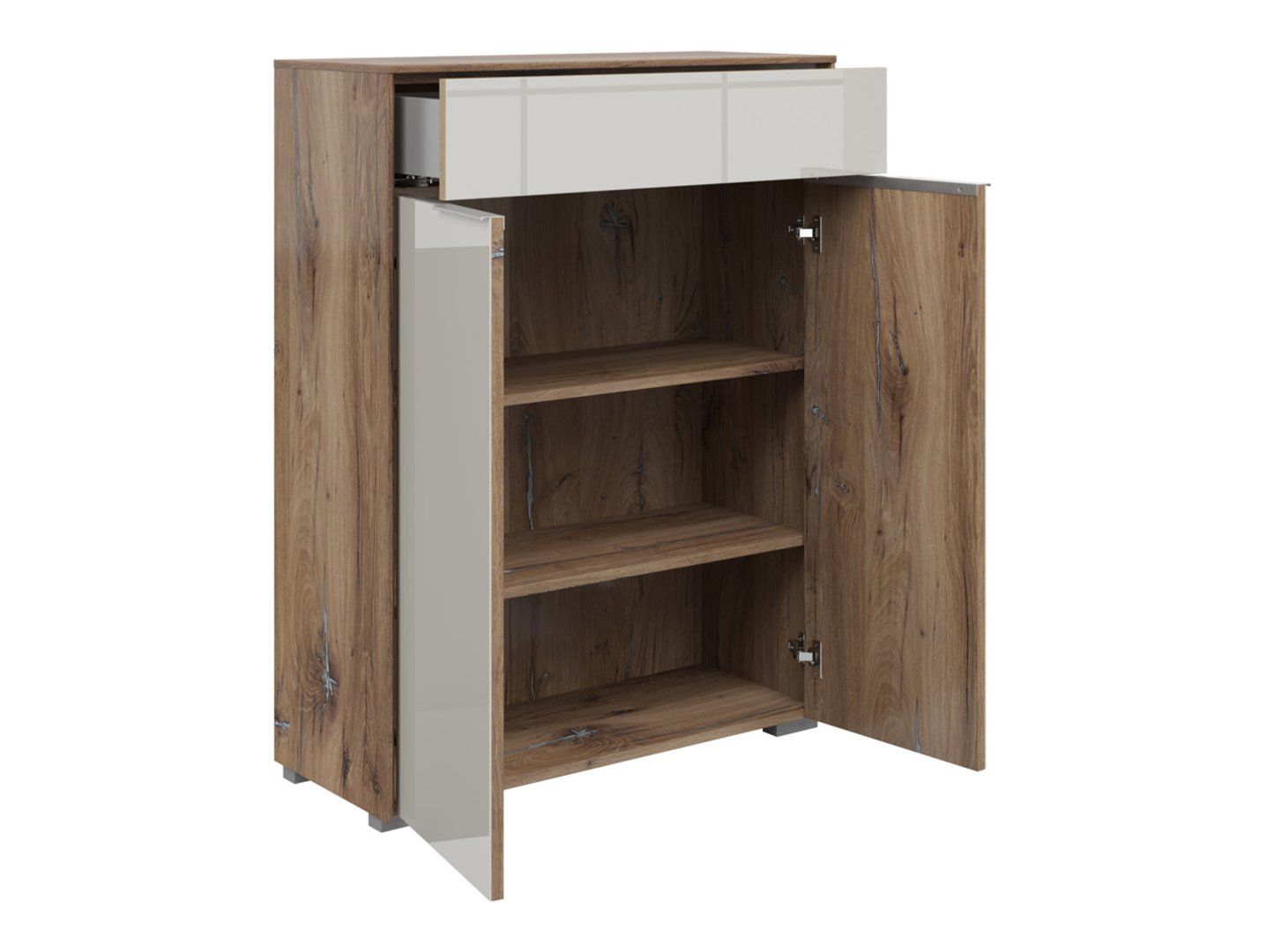 Nevada Chest of Drawers – Office Organization Under ControlThe Nevada Chest of Drawers is an elegant and functional piece of furniture from the Nevada office collection that combines modern design with practicality. Made of high-quality materials and available in a timeless flagstaff oak finish with silk gray glass fronts, the Nevada chest of drawers will fit perfectly into any office space, giving it a modern and stylish character. Special features of the Nevada chest of drawers: Dimensions of 81 x 110 x 37 cm allow for convenient storage in a compact form. Two doors reveal a spacious interior, ideal for documents, books, and other office accessories. A wide drawer provides additional space for small items such as pens, notebooks, or electronics. Fronts covered with tempered glass lacquered in a silk gray shade give the chest of drawers an elegant, modern look. Minimalist lines and subtle details emphasize the timeless, universal character of the furniture. Part of the Nevada collection, which allows you to create a cohesive and elegant office interior. Style and functionality in the office. The Nevada chest of drawers is the perfect solution for those seeking elegance and functionality in one. The well-thought-out interior layout and minimalist design make it a versatile piece that will complement any office, adding order and harmony. Its solid construction guarantees long-lasting use, while its modern finish adds class and style to any office space. The Nevada chest of drawers is a stylish and practical choice for those who value aesthetics and office organization. Thanks to its well-thought-out design and high-quality workmanship, the Nevada chest of drawers offers space for storing and organizing office accessories, while maintaining an elegant appearance. It’s the perfect piece of furniture that will bring harmony and functionality to any interior, meeting the needs of every user.