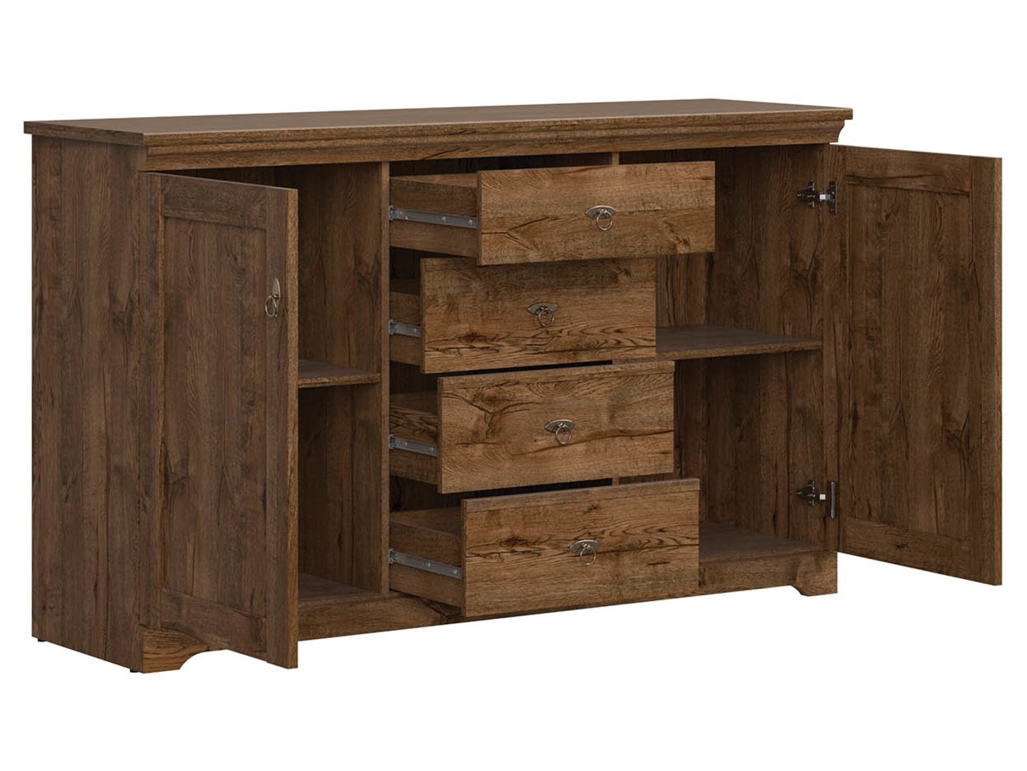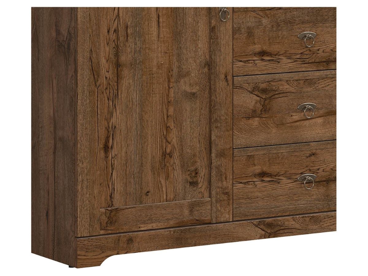 The Patras Chest of Drawers, part of the classic collection, is distinguished by its smooth fronts, striking finials, and stylized handles. If you’re looking for a piece of furniture with ample storage capacity and functionality, the Patras Chest of Drawers will meet your expectations. Two outer cabinets and four central drawers allow you to organize everyday items neatly and easily access them. The wide top offers space for a vase of flowers, decorations, or family photos. The deep April oak color gives the piece a warm character, adding a cozy feel to the interior. Stylized handles in an antique silver color add character to the collection. An additional advantage of the chest of drawers is the use of soft-close accessories, which allow the fronts to close silently, adding elegance to the piece. Thanks to the modular design of the Patras collection, you can easily create your dream living room, bedroom, or hallway arrangement.