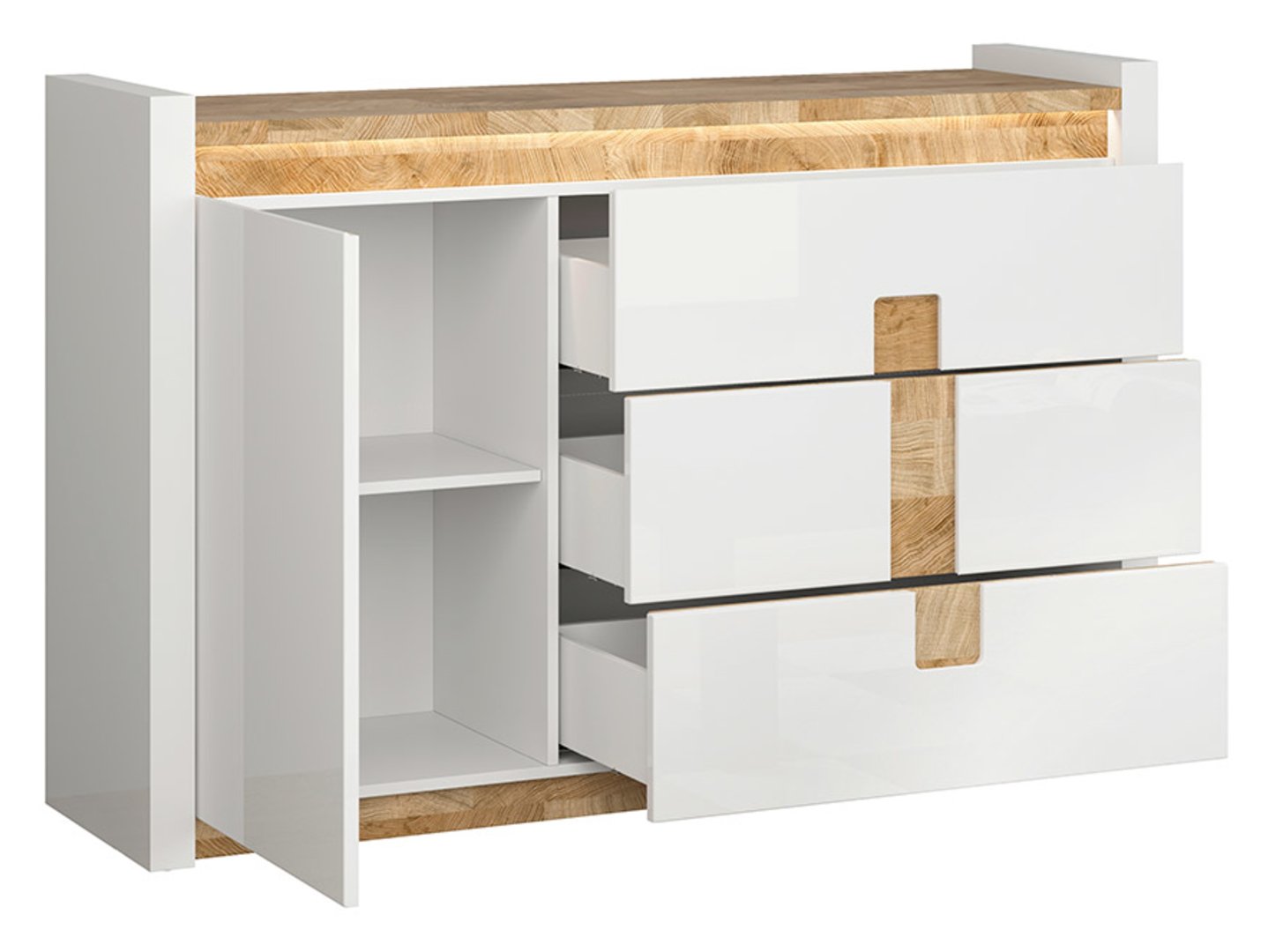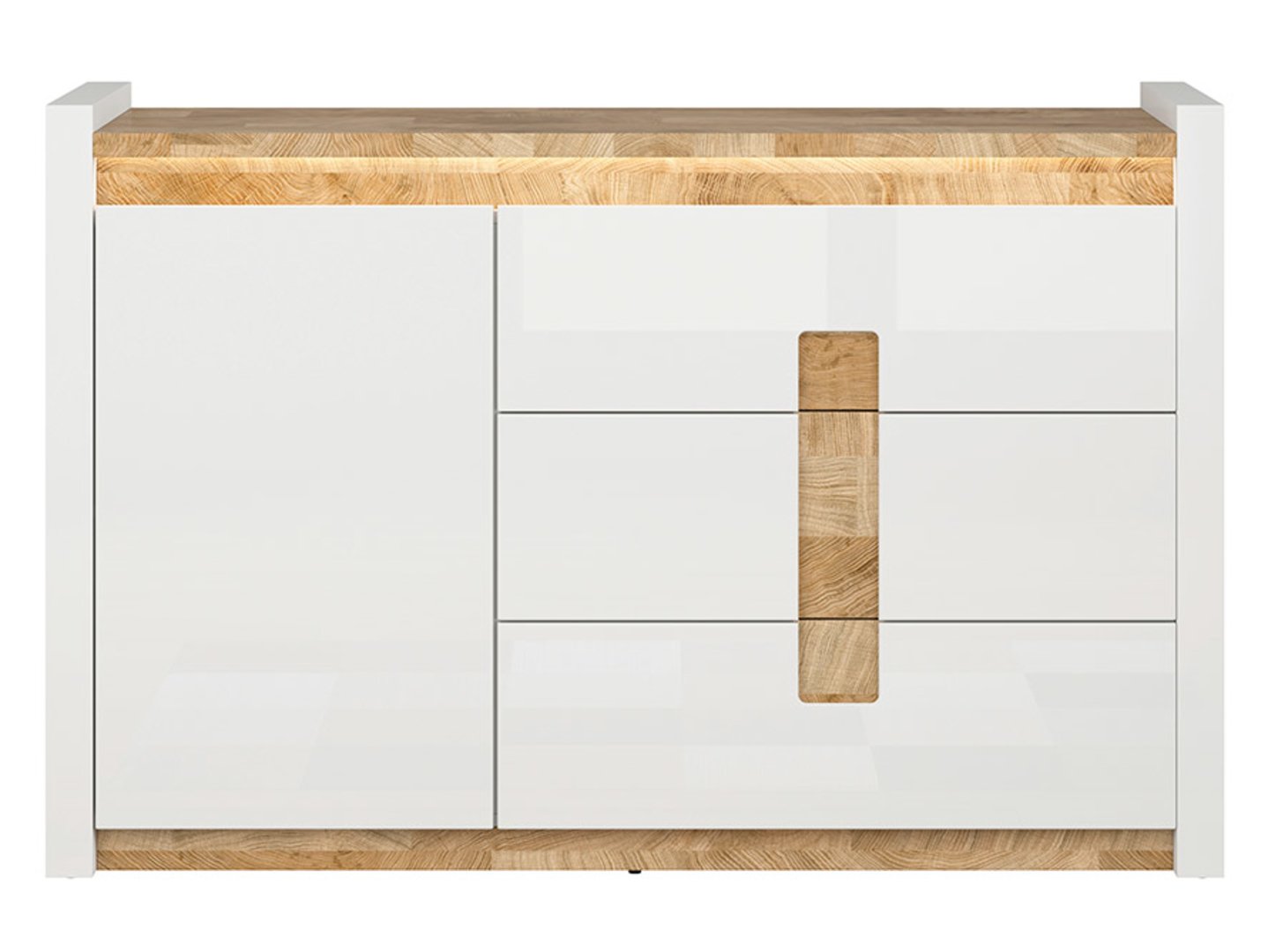 The Alameda Sideboard is a modern and stylish solution for your living room. Spacious Storage: The Alameda Sideboard features three spacious drawers and a cabinet, providing ample storage space for a variety of items. It’s the perfect place for things you want to keep out of sight but close at hand. LED Lighting: LED lighting under the top not only creates a pleasant ambiance in the room but also makes it easier to find necessary items in the sideboard, especially at night. Elegant Design: The glossy white finish of the body and fronts is modern and complements a wide variety of interior styles. Additionally, the Westminster Oak top adds a natural charm to the sideboard. Decorative Details: The decorative details on the drawers add charm and character to the sideboard, breaking up the plain appearance of the fronts. Soft-close hinges allow for silent closing of the drawers and cabinet doors, which is especially useful when you want to avoid noise. Cohesive Arrangement: If you have other furniture from the Alameda collection, this chest of drawers will perfectly complement your entire living room, creating a cohesive and modern look. The Alameda chest of drawers is an excellent storage and organization solution for your living room, combining functionality with aesthetics. Thanks to its many advantages, you can create an elegant and functional space in your home.
