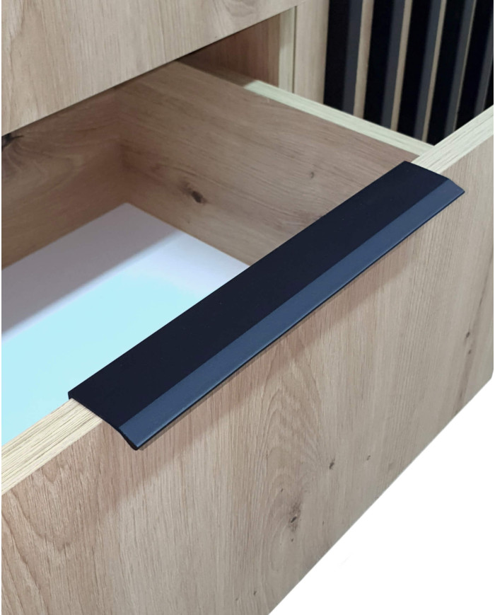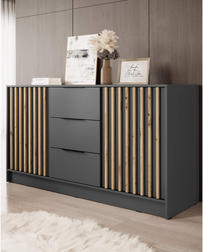 The large and spacious Nelly 3D chest of drawers with doors and drawers, finished in an elegant graphite color and artisan oak slats, will be a true addition to contemporary bedrooms, living rooms, parlors, as well as hallways and hallways. The piece is constructed from scratch-resistant laminated board, offering increased scratch resistance and easy cleaning. The set features two hinged doors, behind which the space is divided by a horizontal shelf. Three spacious and very practical drawers, located in the center of the unit, ensure organized storage of small items, belongings, and knick-knacks. The set is distinguished by its color scheme and elegant slats. The chest of drawers with doors and drawers is delivered ready-to-assemble, with clear instructions and hardware.