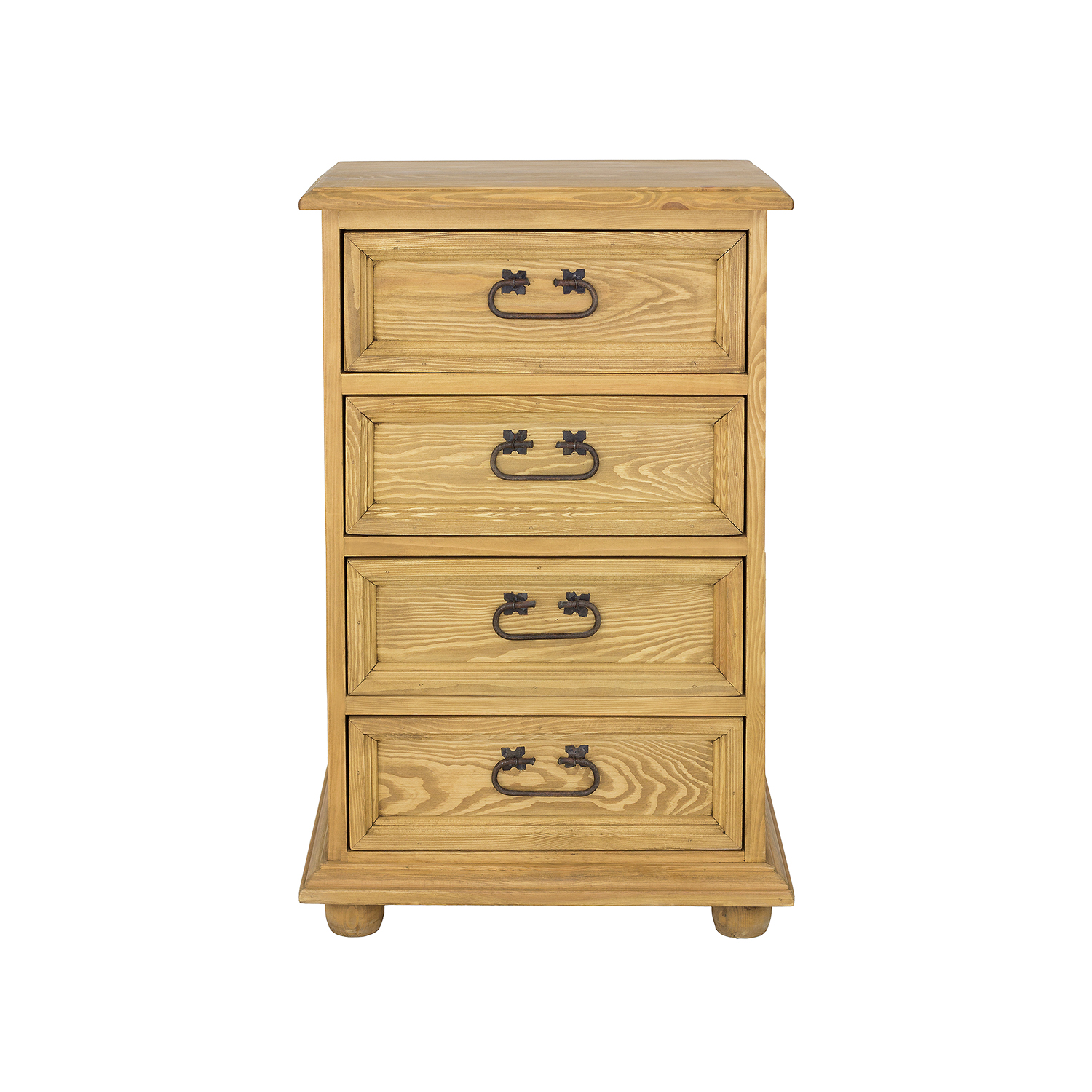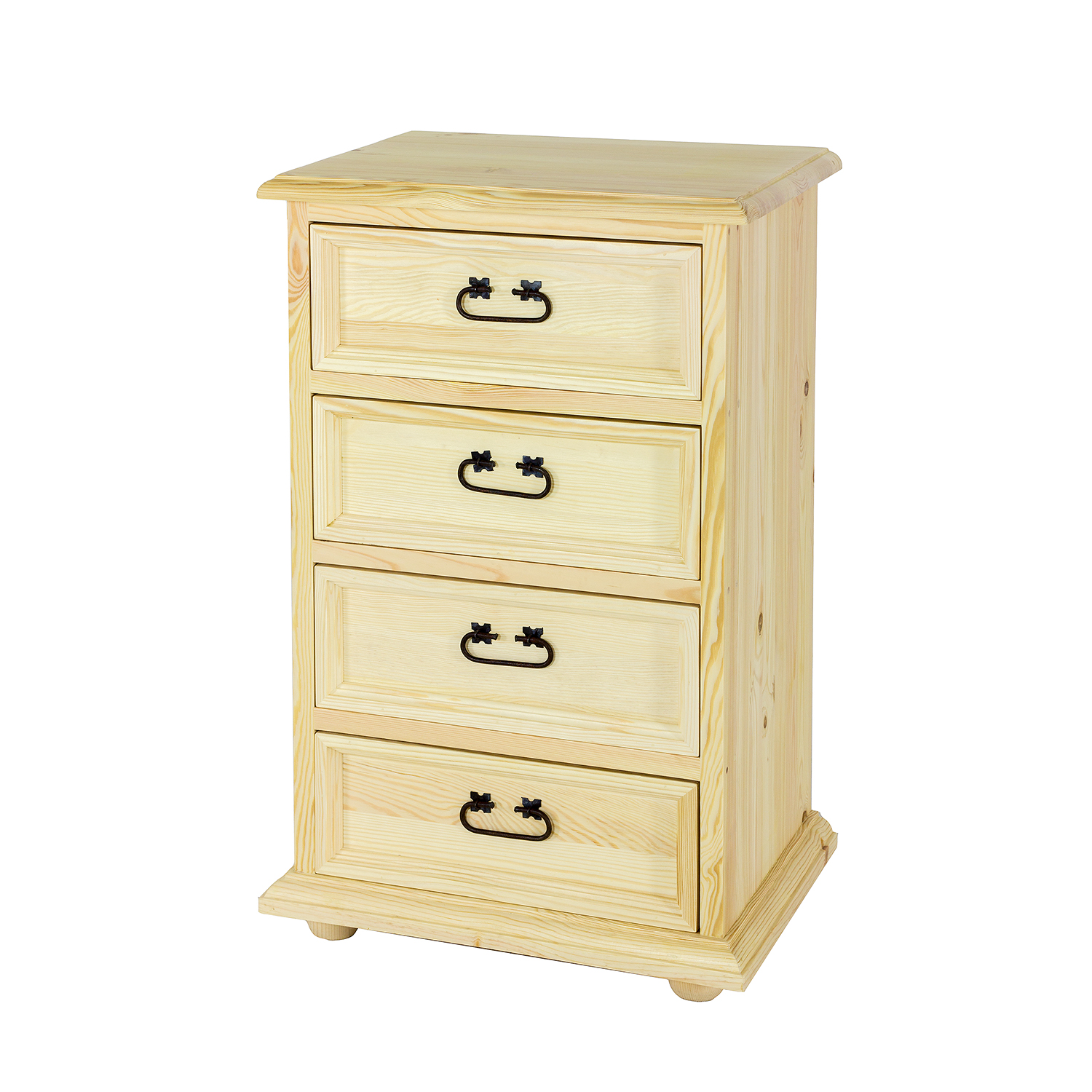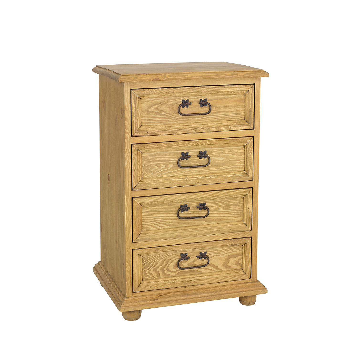 The KD700 SLIM waxed chest of drawers, designed in a rustic style, is crafted entirely from solid pine wood. It consists of a row of four drawers that slide on wooden slides. Handcrafted metal handles and antique-effect hinges are used. The chest of drawers boasts a durable and robust construction. It’s perfect for bedrooms and dressing rooms. It will add a unique atmosphere to any interior, full of warmth and family. Its functionality makes storage much easier.