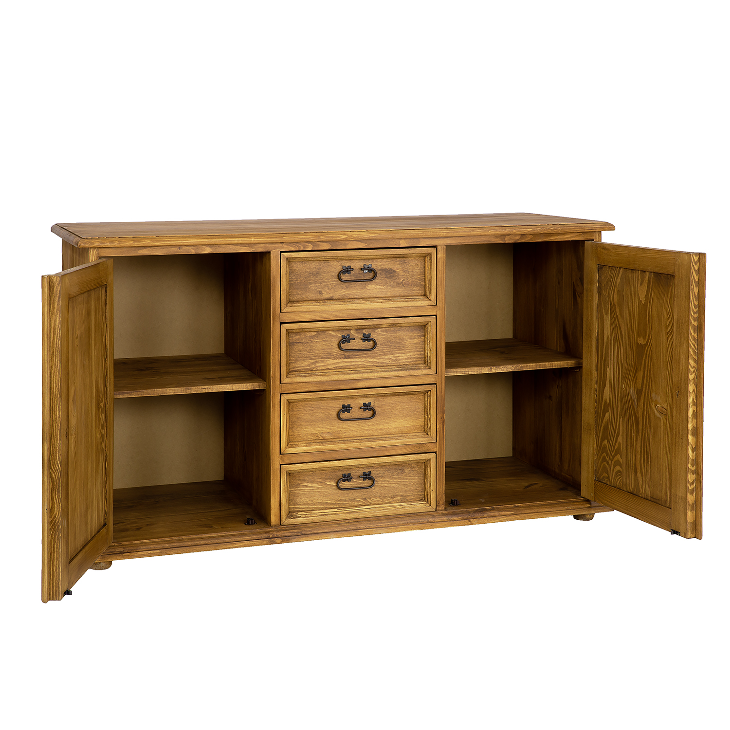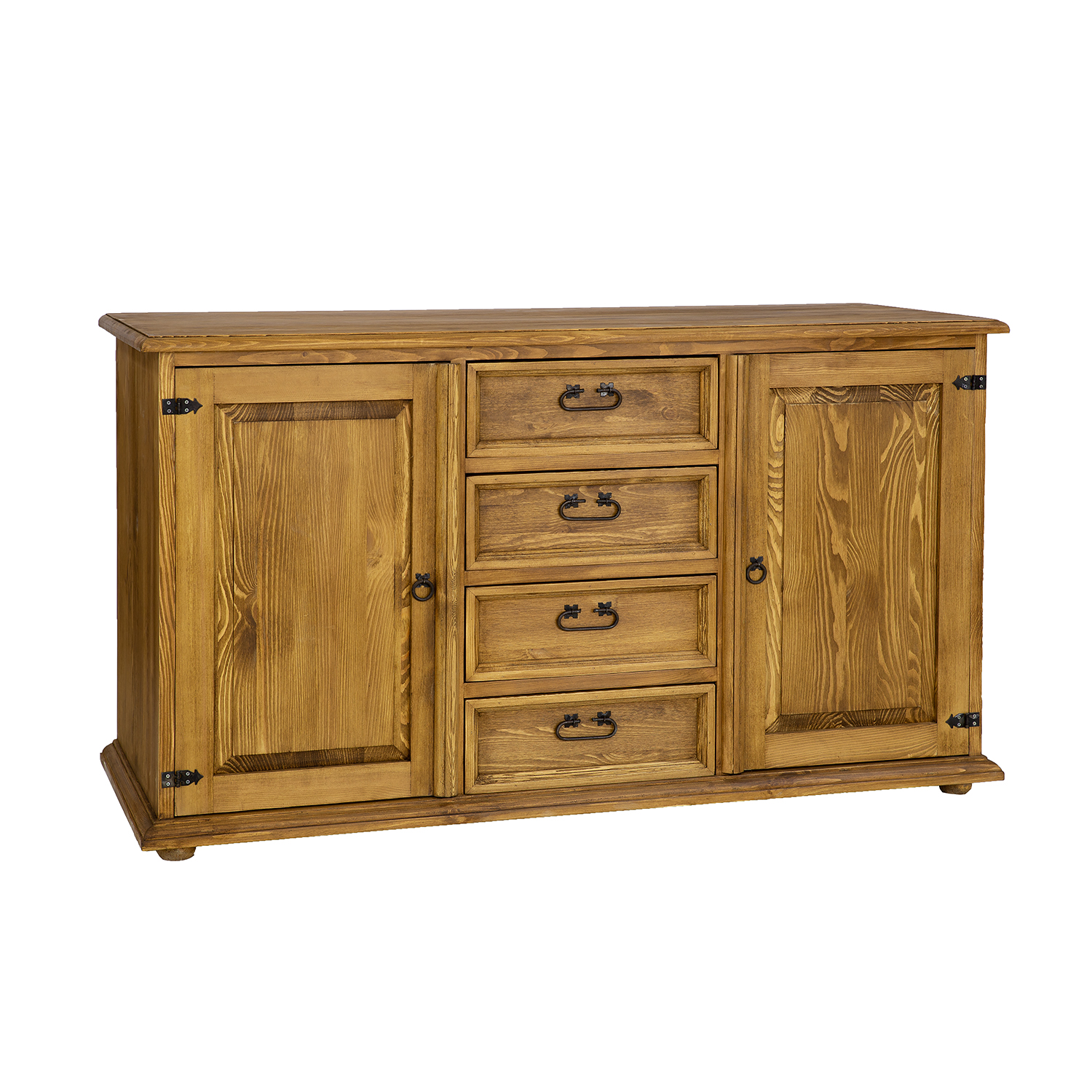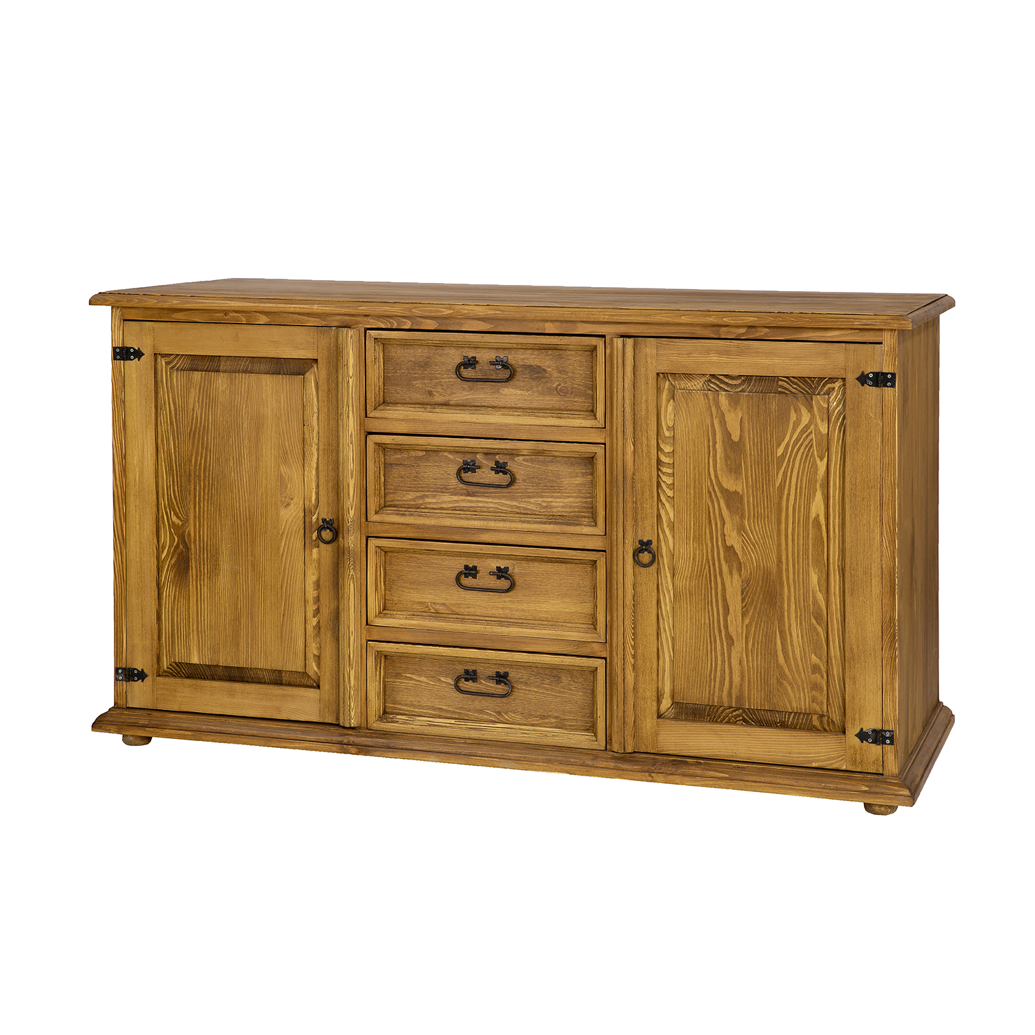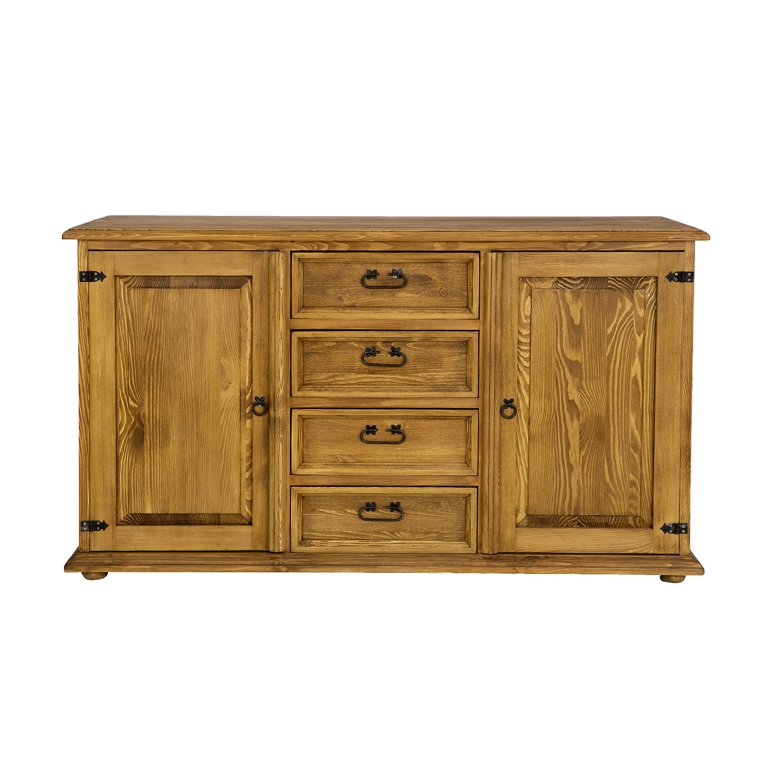 The STANDARD KD809 waxed chest of drawers is designed in a rustic style and crafted entirely from solid pine. It features two exterior cabinets with doors (each with a shelf inside) separated by four drawers that slide out on wooden runners. Handmade metal handles and antique-effect hinges are used in its construction. The chest of drawers has a durable and solid construction. It will be perfect for a living room, bedroom, or dressing room. It will add a unique atmosphere to any interior, full of warmth and family. Its functionality will make storage much easier.