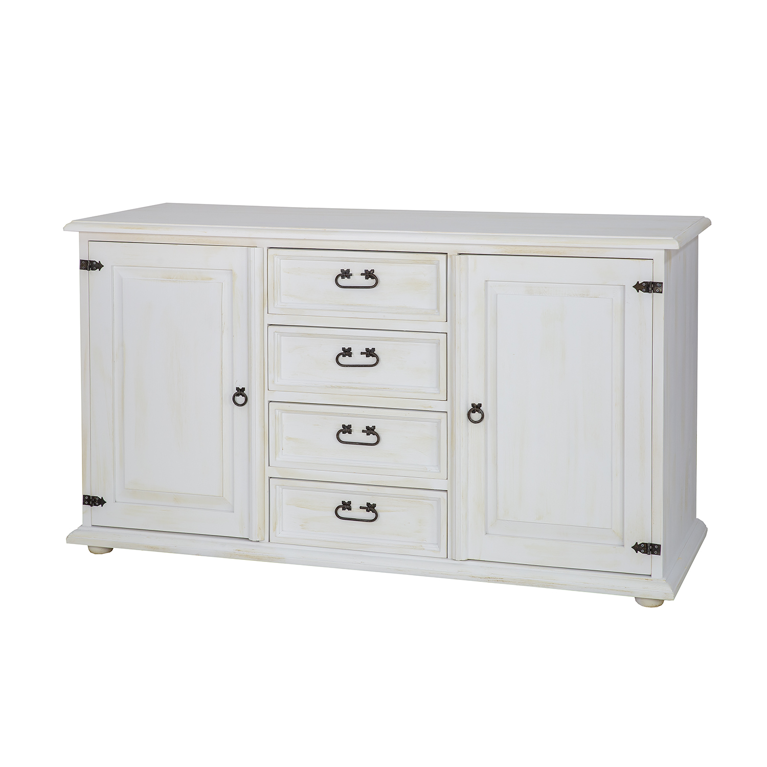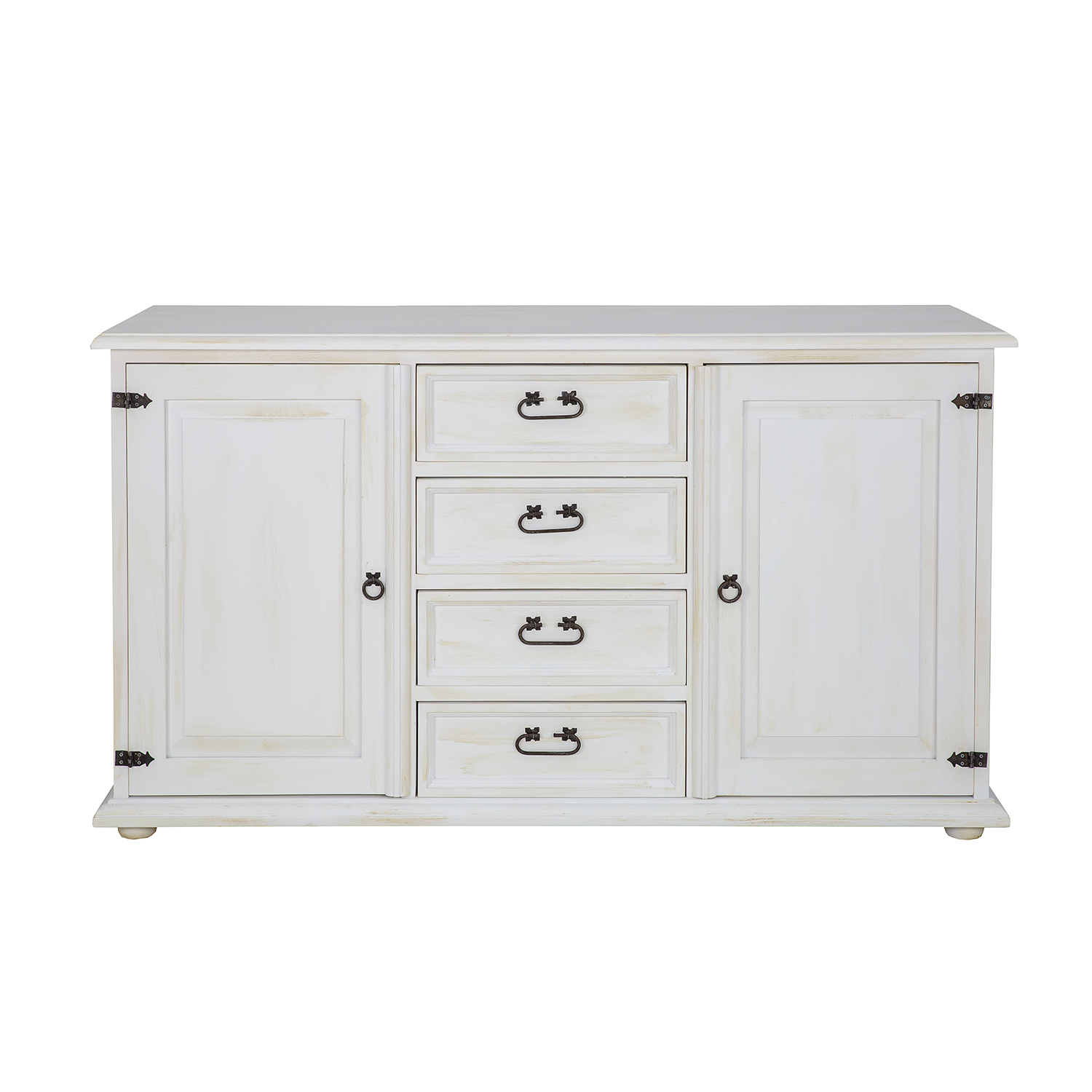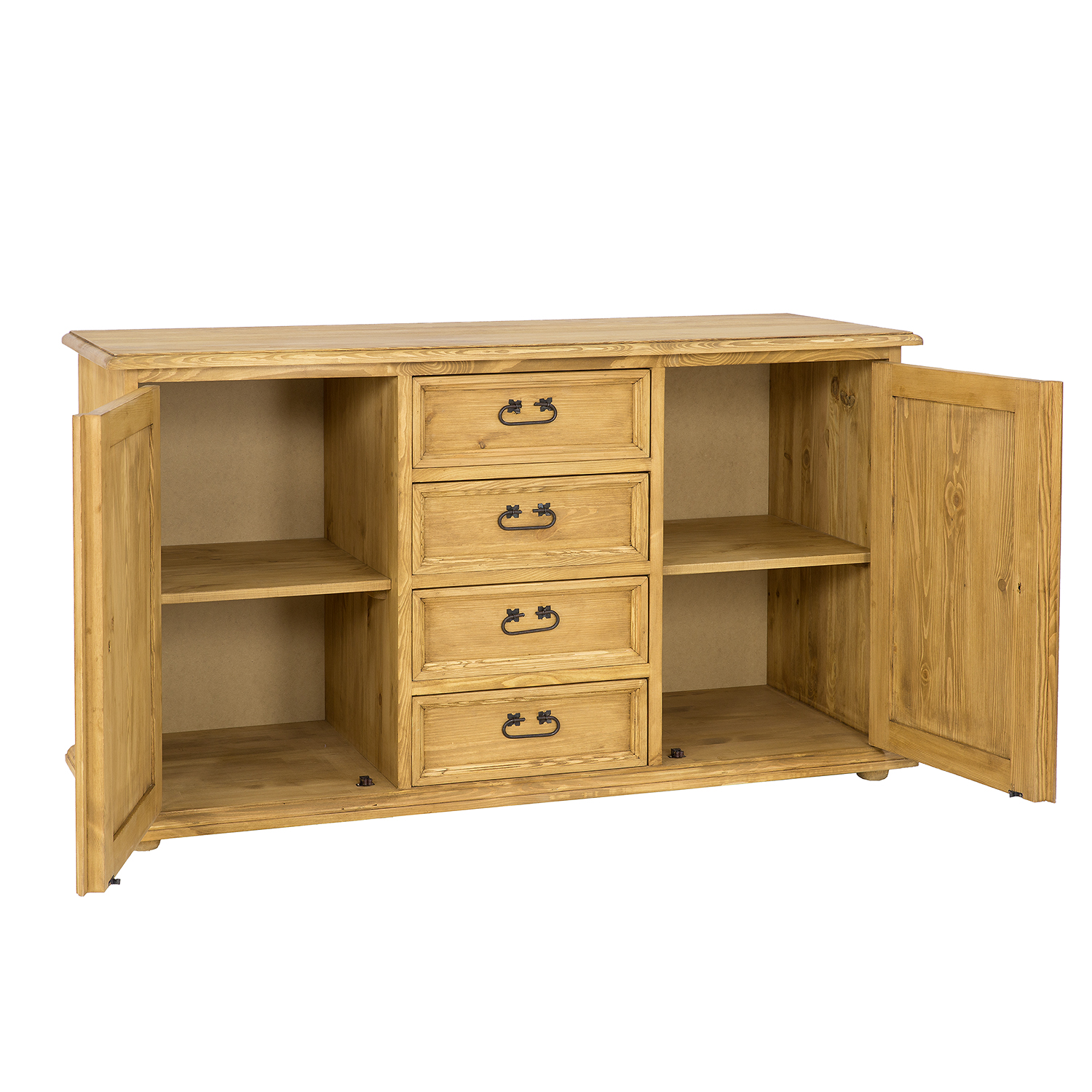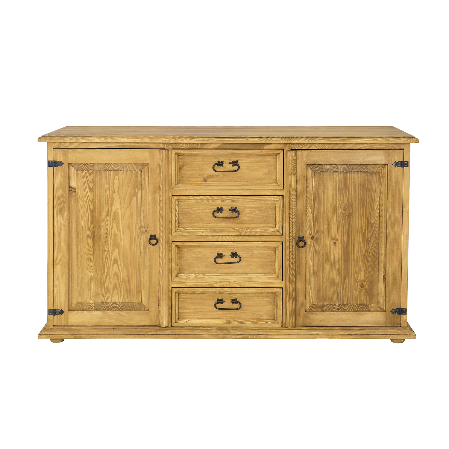 The STANDARD KD809 waxed chest of drawers is designed in a rustic style and crafted entirely from solid pine. It features two exterior cabinets with doors (each with a shelf inside) separated by four drawers that slide out on wooden runners. Handmade metal handles and antique-effect hinges are used in its construction. The chest of drawers has a durable and solid construction. It will be perfect for a living room, bedroom, or dressing room. It will add a unique atmosphere to any interior, full of warmth and family. Its functionality will make storage much easier.