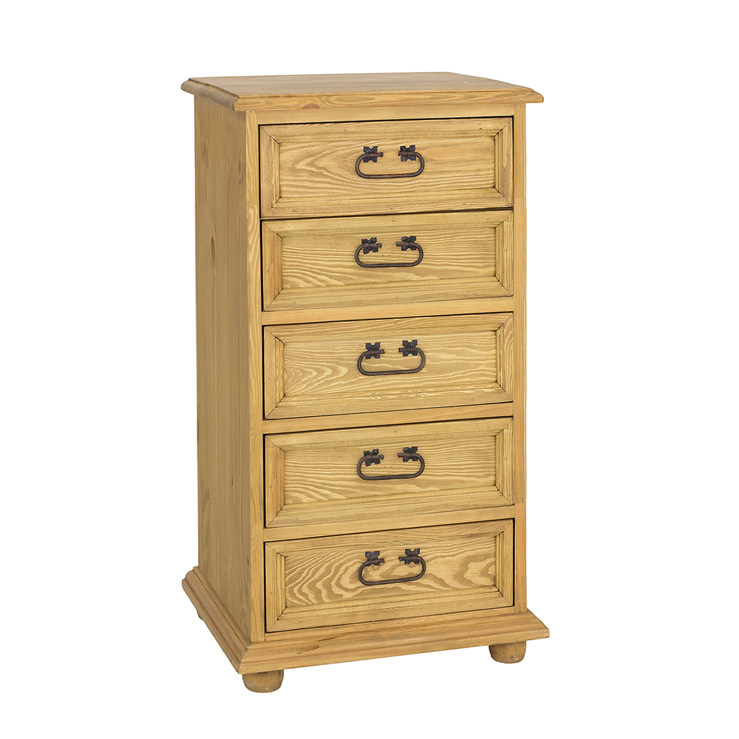 The waxed KD817 chest of drawers in the STANDARD version, designed in a rustic style, is made entirely of solid pine wood. It consists of a row of five drawers, sliding on wooden slides. Handcrafted metal handles and hinges with an aged effect were used in its construction. The chest of drawers has a durable and solid construction. It is perfect for bedrooms and dressing rooms. It will add a unique atmosphere to any interior, full of warmth and a family atmosphere. Its functionality will make storage much easier.