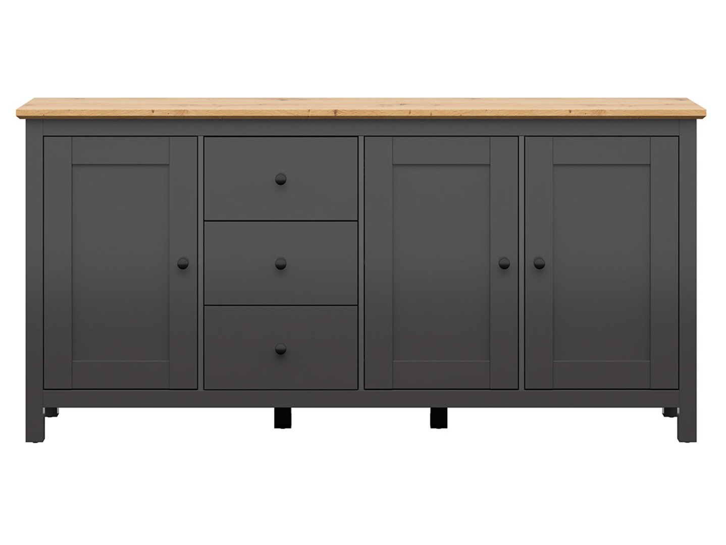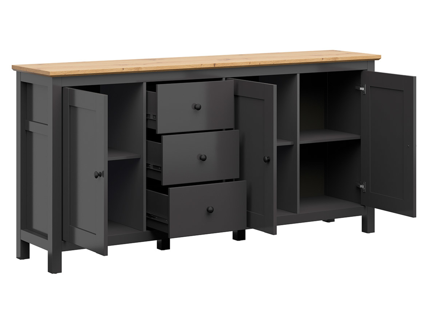 The Hesen Chest of Drawers – the elegance of simple forms for your interior. If you value furniture with simple forms that retain elegance and versatility, the Hesen collection will meet your expectations. This furniture is not only stylish but also easily adapts to various interior styles. If you enjoy experimenting with accessories and changing your decor, the Hesen Chest of Drawers will be the perfect backdrop for your creative transformations. The Hesen Chest of Drawers is not only an elegant storage unit but also a decorative element that brings a Nordic touch to your living room. It offers additional storage space, and the wide top is the perfect place to display family photos or other decorations. Three practical drawers allow you to organize smaller items. One single-door cabinet offers space for larger items. One double-door cabinet provides even more storage space. Three shelves divide the cabinets into six practical compartments, making space organization easier. The simple design of the chest of drawers perfectly complements its elegant finish. The graphite color of the chest of drawers contrasts beautifully with the top in artisan oak or light Sibiu larch, while the delicate milling on the fronts and small, pointed handles lend the piece a subtle touch. An additional advantage of the Hesen chest of drawers is the hinges with a built-in soft-close system, which make using the cabinets comfortable and silent. The drawers feature full-extension guides, making access to their contents easy. The Hesen chest of drawers is not only a practical piece of furniture but also a distinctive element of interior design. If you care about cohesive design, consider the other pieces from the Hesen collection to create a harmonious and stylish interior in your living room, bedroom, or other room. Let the Hesen chest of drawers help you maintain order and add elegance to your home.