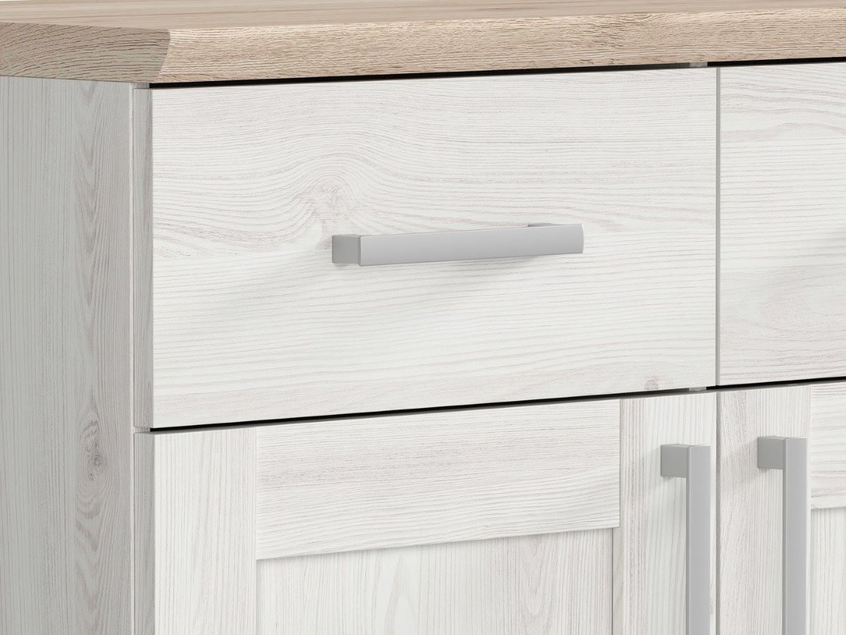 Romance Chest of Drawers – A Harmony of Capacity and Elegance. Your living room is a space where elegance and coziness merge into one harmonious whole. The Romance collection, inspired by Scandinavian design, will bring not only style but also functionality to your living room. The Romance Chest of Drawers offers not only ample storage but also a focal point that will distinguish your space. The chest of drawers’ capacity is one of its many advantages. Practical cabinets and three handy drawers allow you to efficiently organize various items while maintaining the aesthetics of the interior. The chest of drawers’ long top is the perfect place to display family photos, decorative items, or fresh flowers. The Romance collection is distinguished by its captivating combination of light Sibiu larch fronts with San Remo oak-stained top and bottom edges. This combination gives the furniture a lightness, while also adding character and elegance. The frames on the fronts are details that emphasize the collection’s solidity, evoking traditional furniture from northern Europe. These subtleties make the chest of drawers not only a practical piece of furniture but also an aesthetic addition to the interior. Designer accessories and simple silver handles ensure easy access to the chest of drawers’ contents. Ergonomic solutions make its use comfortable and intuitive. The Romance chest of drawers is just one of many elements in the collection, which also includes chests of drawers, bookcases, TV stands, shelves, and mirrors. Combine these elements to create a cohesive and ergonomic living room where functionality goes hand in hand with elegance. Let the Romance chest of drawers become the heart of your living room, adding harmony, style, and order.