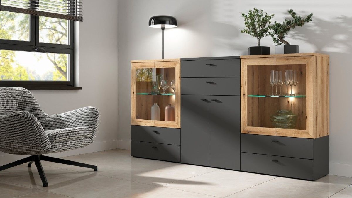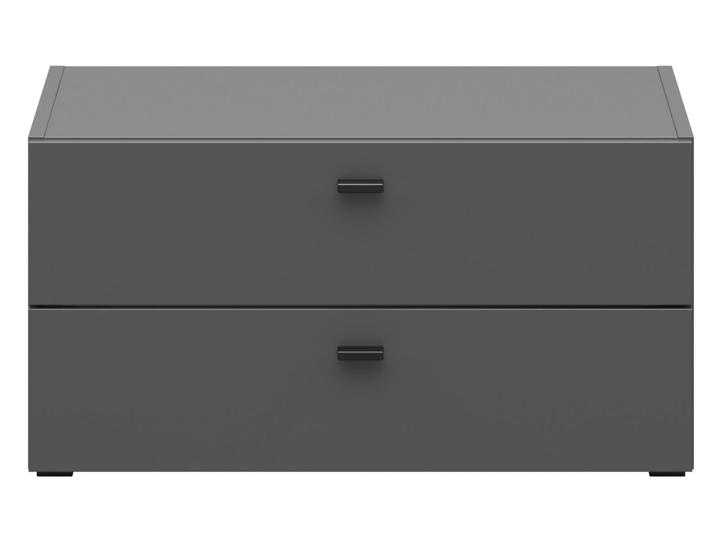 System 64 Chest of Drawers – A Modular Interior Your Way. The System 64 collection is a modern set of modular furniture with modules measuring 64 cm wide and 32 or 64 cm high. All modules have a common depth of 35 cm, allowing them to be freely combined to create chests of drawers, TV cabinets, bookcases, entire wall units, and office spaces for storing documents. Each module can be free-standing, wall-hung, or stacked. Available colors include white, Evoke Oak, and graphite, providing almost unlimited configuration options. Optional LED lighting for the glass shelf or the entire interior is available for the display cabinets. In addition to the modules, tabletops are available in lengths of 64, 128, and 192 cm to easily create cohesive chests of drawers, TV stands, sideboards, and tall glass-fronted units. Functionality and Configuration: The System 64 2-Drawer Chest is a compact, practical piece of furniture measuring 64x32x35 cm, perfect for a living room, bedroom, office, hallway, or child’s room. Two spacious drawers provide convenient storage for small items, documents, and accessories, while smooth-running slides enhance comfort. The simple form and minimalist fronts emphasize the modern character, while the solid chipboard construction guarantees durability. The surfaces are easy to clean. The sideboard can function as a standalone unit or become part of a larger System 64 unit. When combining and stacking modules, it is recommended to secure the set to the wall using the included mounting hardware for maximum stability. Special Features: Dimensions: 64 x 32 x 35 cm, Two spacious drawers with easy access, Maximum load capacity: 13 kg, Can be combined with other System 64 modules, Available colors: White, Evoke Oak, Graphite, Installation: Standing, Hanging, or Stacking, Solid furniture board and easy-to-clean surfaces, Optional LED lighting in display cabinets (glass shelf or the entire interior), 64/128/192 cm countertops for creating sideboards and TV cabinets, Wall mounting hardware included, Color: Graphite. Summary: The System 64 2-Drawer Sideboard combines functionality, modern minimalism, and flexible configuration. Thanks to its modular design, you can easily adapt it to your space and style, creating a cohesive, practical interior in your chosen color scheme.