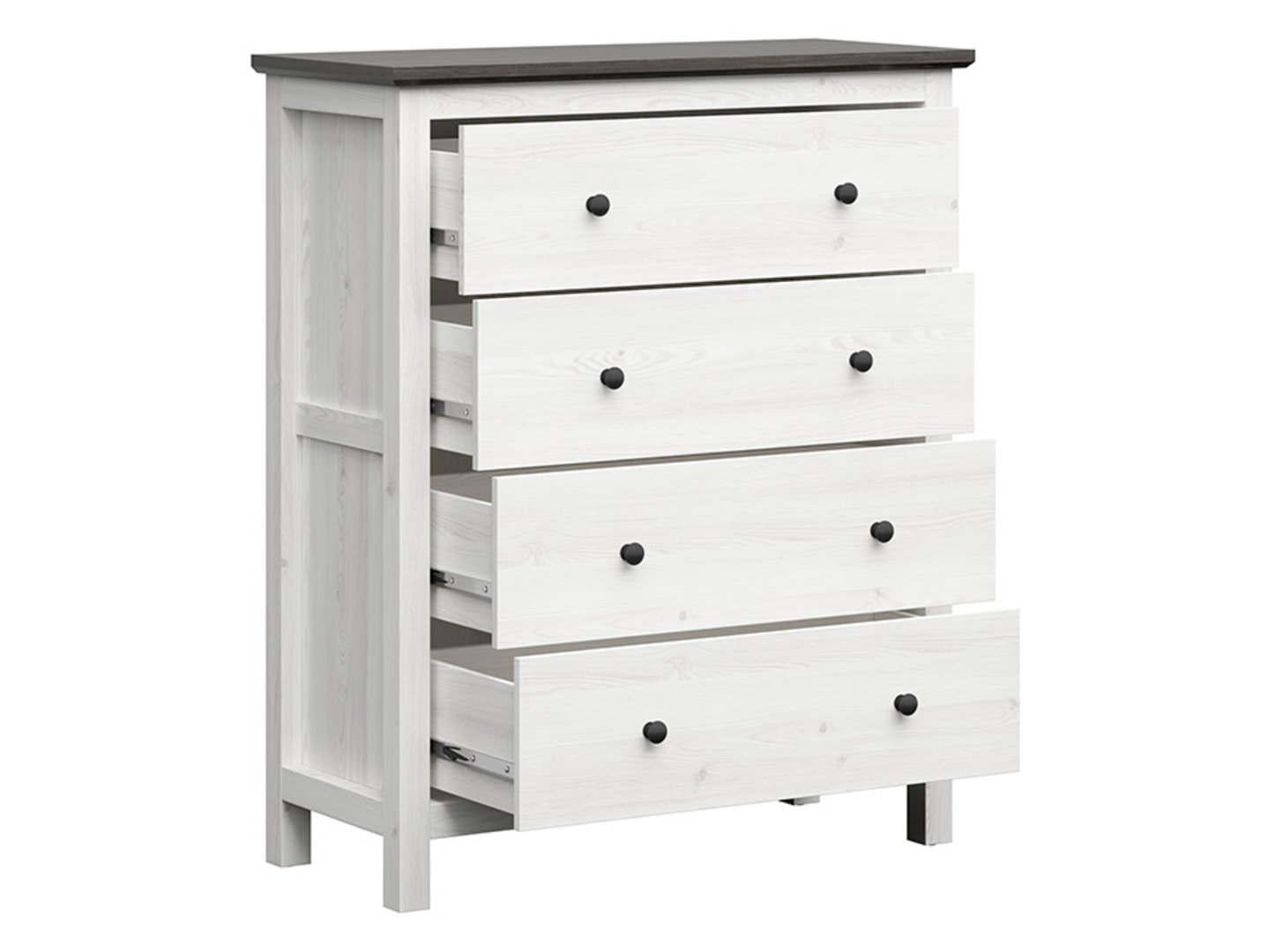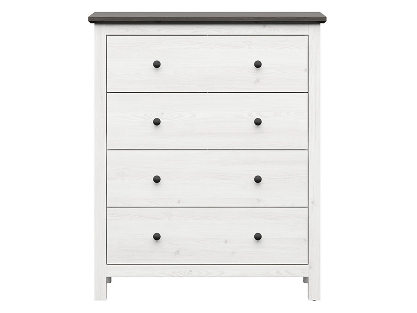 The Hesen Chest of Drawers – Perfect for a Living Room or Bedroom. The Hesen collection is distinguished by its clear, simple, and minimalist design, making it an excellent choice for family spaces. The sleek and practical Hesen Chest of Drawers fits perfectly into living rooms, bedrooms, and other rooms, such as hallways or offices. This functional piece of furniture, optimally sized, can accommodate a variety of items, depending on your needs. Measuring 101 cm wide and 120 cm high, it offers ample storage options. It features four wide drawers that allow you to organize various items without taking up too much space. Thanks to its compact dimensions, the Hesen Chest of Drawers is perfect even for small spaces. The chest of drawers’ graphite body and warm Artisan Oak top create a harmonious contrast. The second color version, with light Sibiu larch frames and a Larico pine top, adds a pleasant touch to the interior. Knob handles in the same color as the fronts add a touch of subtlety and a stylish finish. The Hesen chest of drawers also features full-extension drawer slides, enhancing its functionality and comfort. This allows you to easily and conveniently access each drawer without having to move the contents. If you value cohesiveness in your interior design, consider other elements from the Hesen collection to create a harmonious look in your living room, bedroom, or other room. The Hesen chest of drawers is the perfect solution for those who value functionality, minimalist design, and elegance all in one.