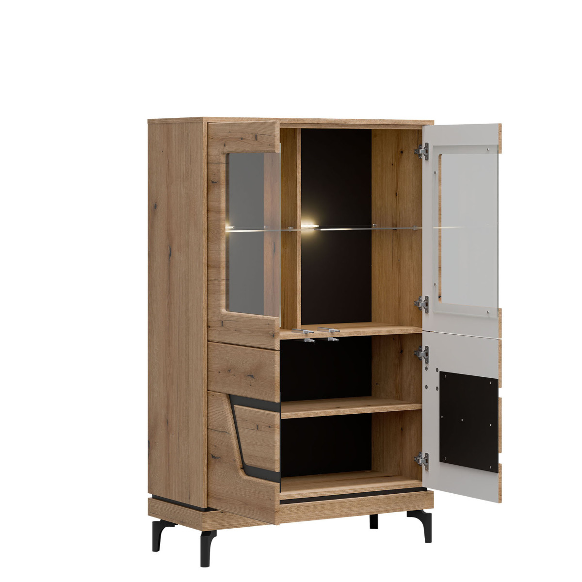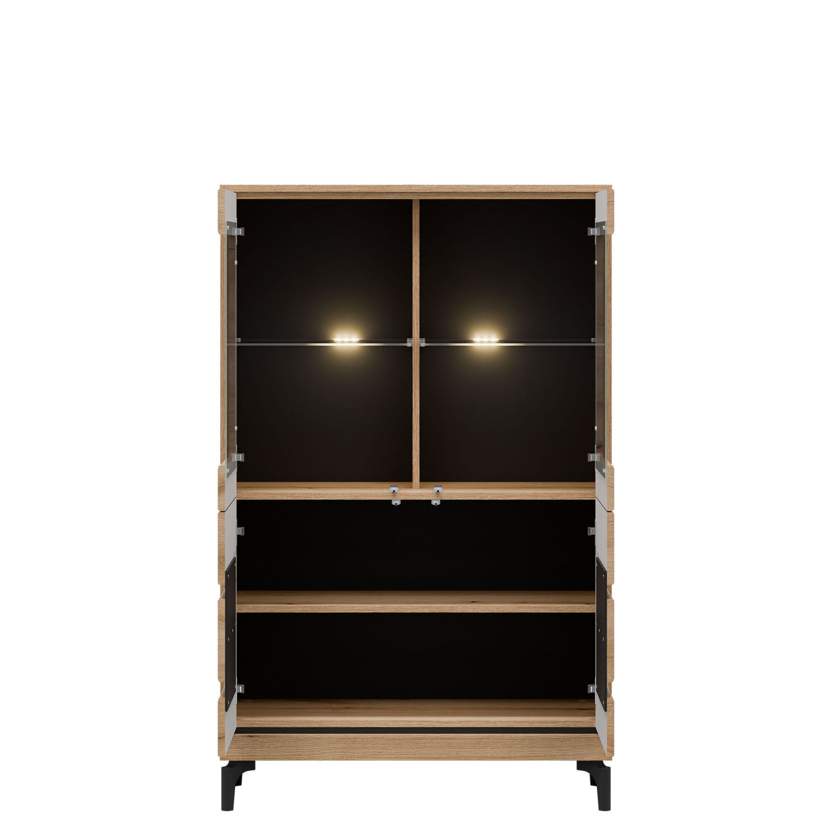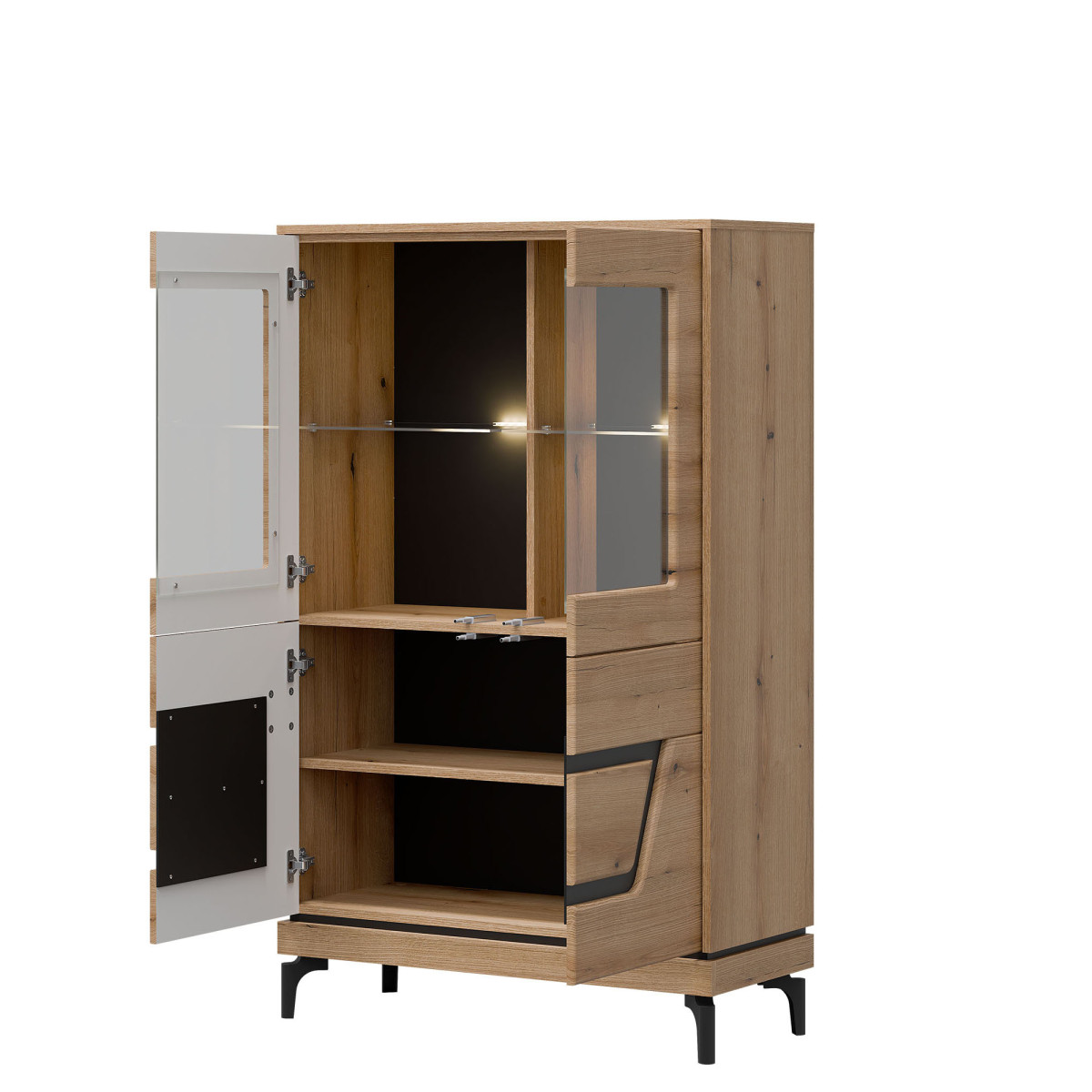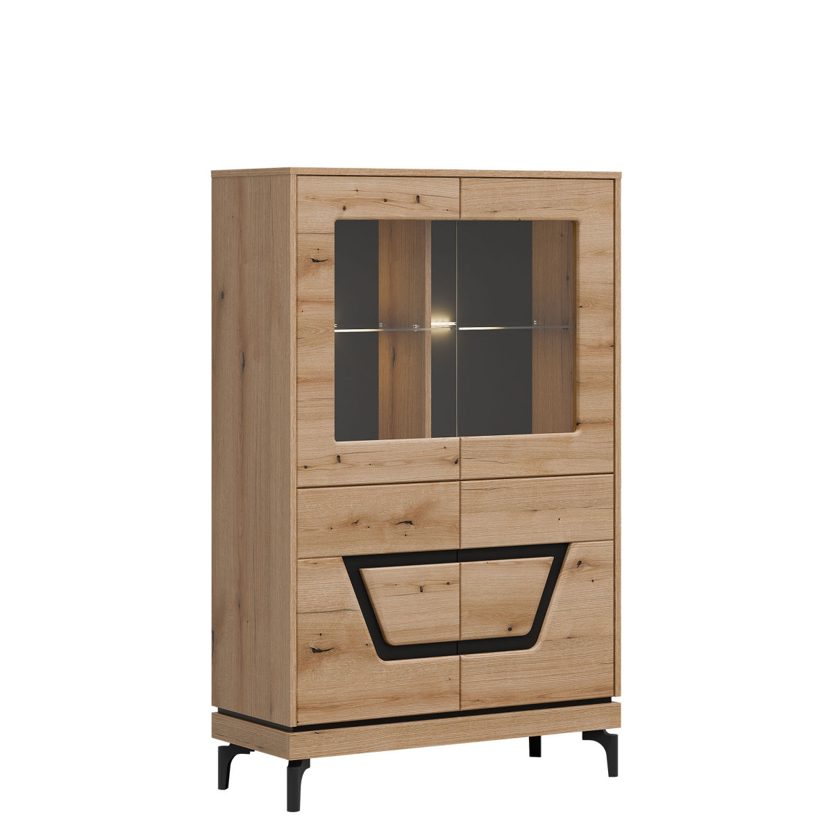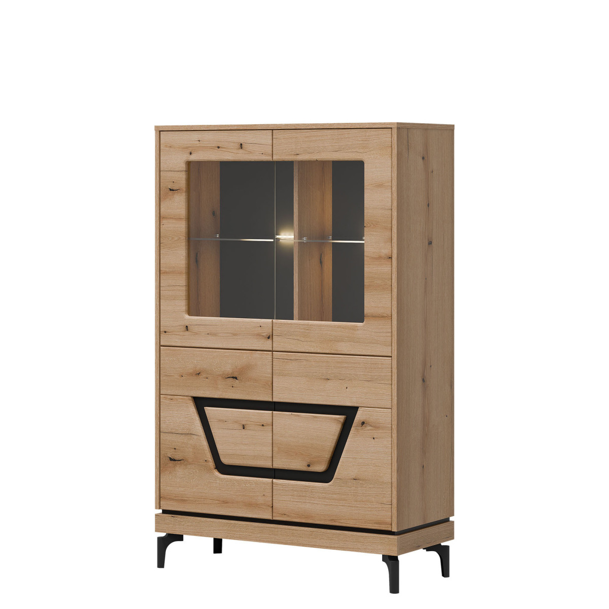 Width 92 cm Depth 38.5 cm Height 147 cm Product weight with packaging 52.75 kg Manufacturer’s code / symbol KS04 Collection name KRIS Name in the b2b system KRIS KS04 EVOKE OAK/BLACK LOW DISPLAY CABINET SET Number of product packages 3 Style Modern Equipment Assembly instructions / assembly accessories Assembly For self-assembly Body color Evoke Oak / Black Body material / type / thickness 16 mm furniture board Top of body material / type / thickness 16 mm furniture board Bottom crown of body material / type / thickness 16 mm furniture board Base of body material / type / thickness 16 mm furniture board Shelf color Evoke Oak Shelf material / type / thickness 16 mm furniture board Crown shelf quantity 1 Back wall material / type / thickness 2.5 mm HDF furniture board Rear wall visible part color Black Front color Evoke Oak / Black Front material / type / thickness 16 mm MDF furniture board / 5 mm HDF furniture board Front hinge ⌀ 35 mm adjustable in three planes Glazed front material / glass color Tempered / transparent Glazed front glass thickness 4 mm Glass shelf glass color Transparent Glass shelf glass thickness 5 mm Glass shelf quantity 2 Door opening system push to open 4 door fronts Leg / material / color Non-adjustable / plastic / black Leg height 120 mm Number of doors 4 Number of closed recesses behind the front glass 4 Number of closed recesses 2