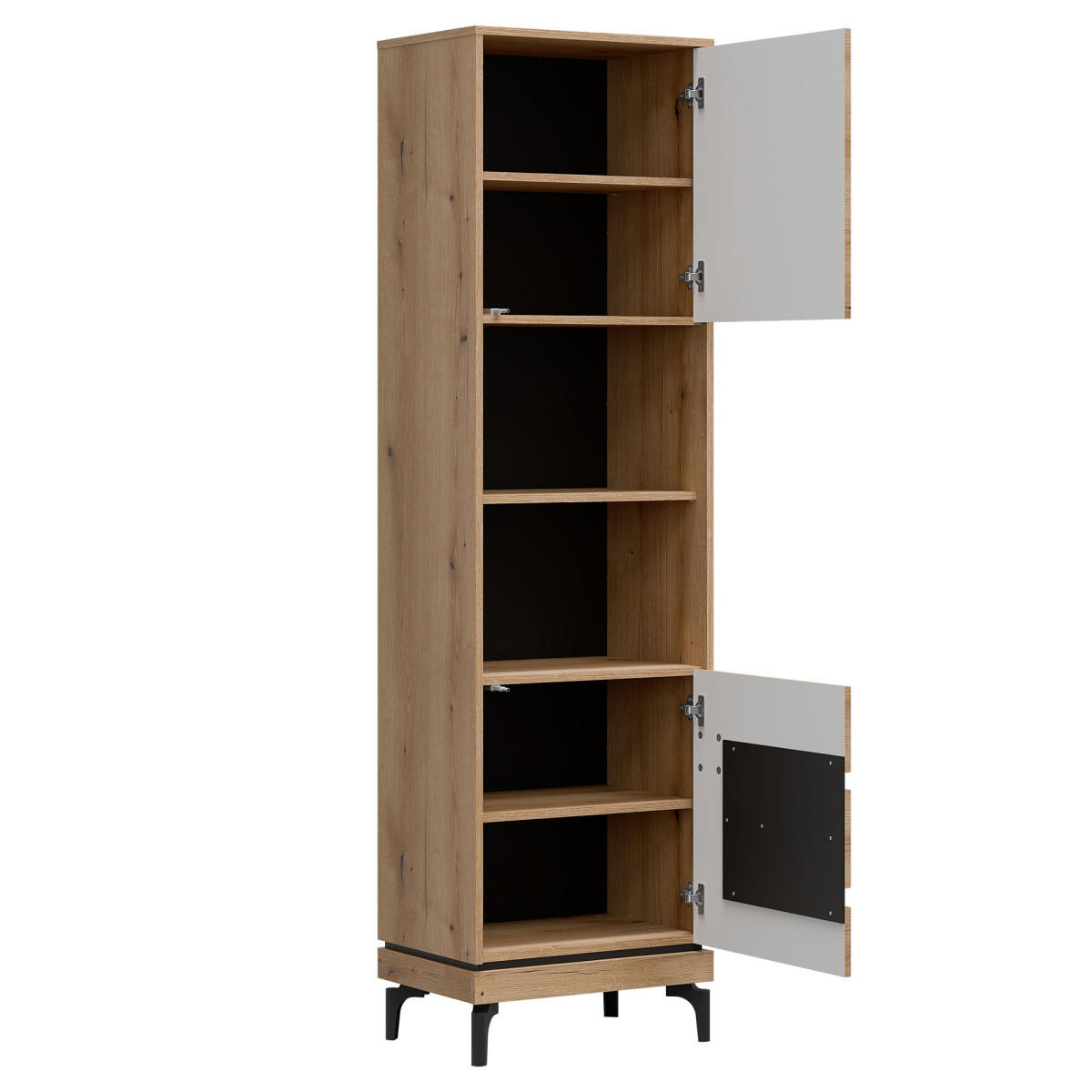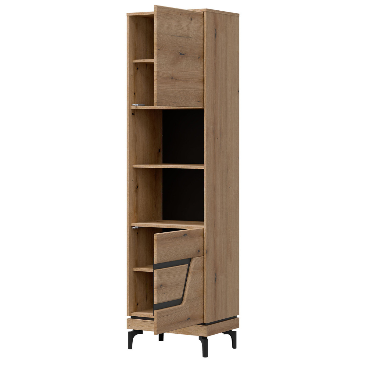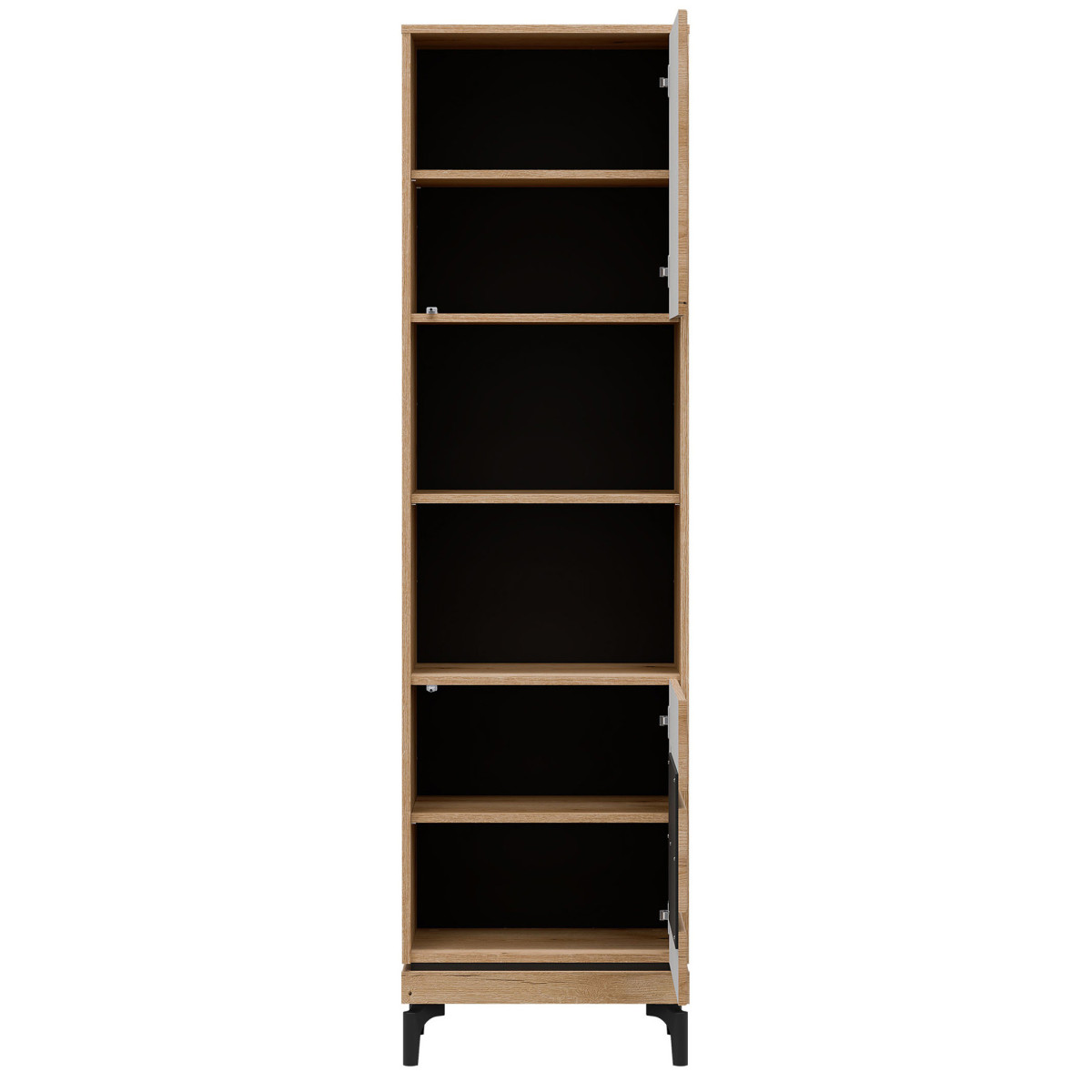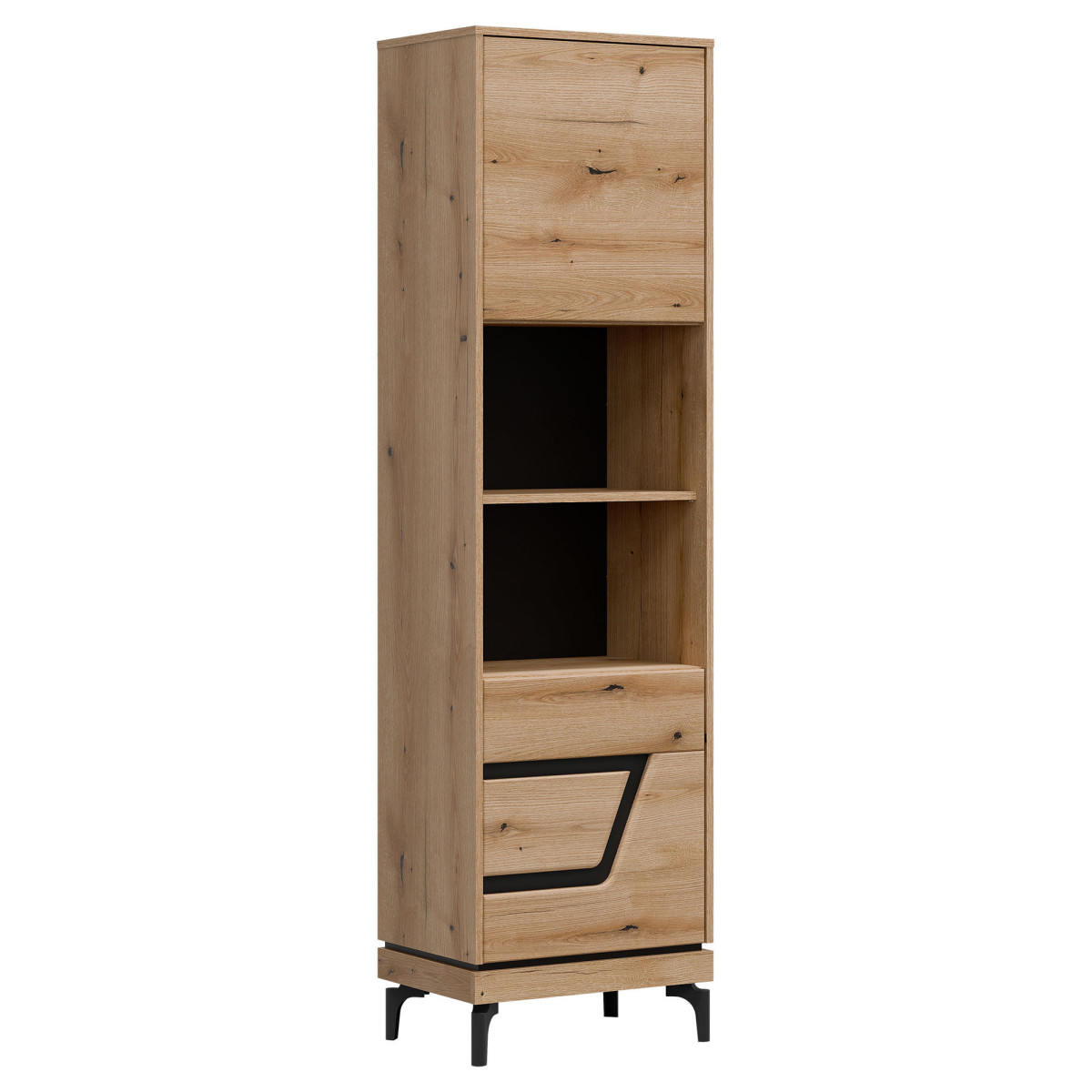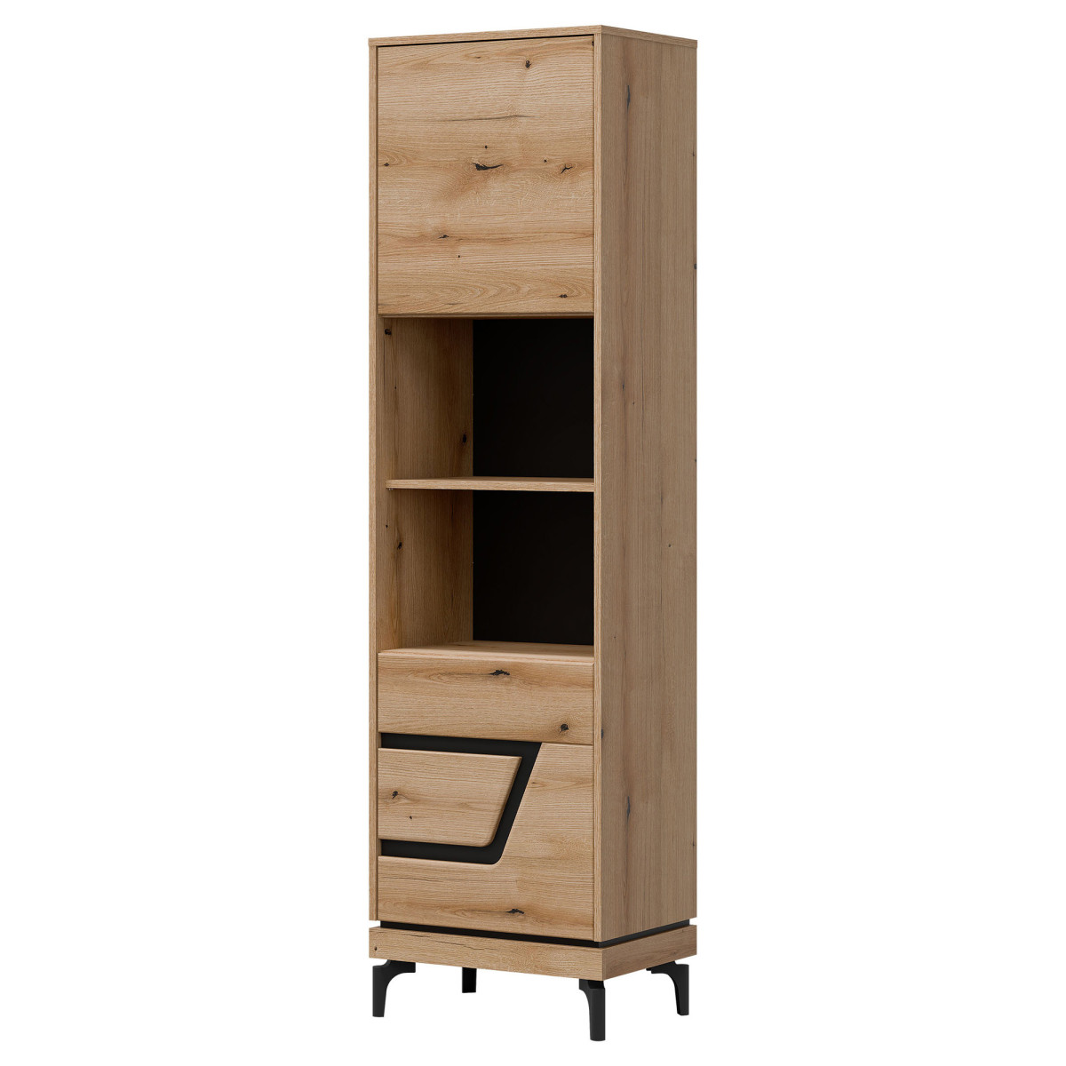 Width 54.5 cm Depth 38.5 cm Height 198 cm Product weight with packaging 43.75 kg Manufacturer’s code / symbol KS08 Collection name KRIS Name in the b2b system KRIS KS08 EVOKE OAK/BLACK SHELVING P SET Number of product packages 3 Style Modern Equipment Assembly instructions / assembly accessories Assembly For self-assembly Body color Evoke Oak / Black Body material / type / thickness 16 mm furniture board Top of the body material / type / thickness 16 mm furniture board Bottom of the body material / type / thickness 16 mm furniture board Base of the body material / type / thickness 16 mm furniture board Shelf color Evoke Oak Shelf material / type / thickness 16 mm furniture board Shelf quantity 3 Back wall material / type / thickness 2.5 mm HDF furniture board Back wall part visible color Black Front color Evoke Oak / Black Front finish material / type / thickness 16 mm MDF furniture board / 5 mm HDF furniture board Front hinge ⌀ 35 mm adjustable in three planes Door opening system push to open 2 door fronts Leg / finish / color Non-adjustable / plastic / black Leg height 120 mm Number of doors 2 Number of open niches 2 Number of closed niches 4