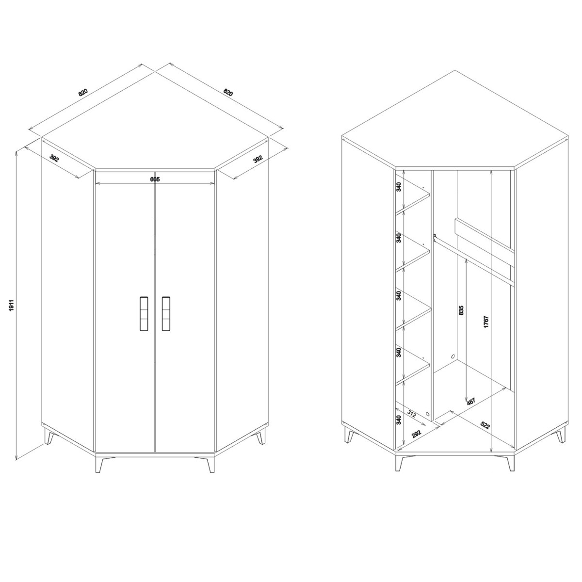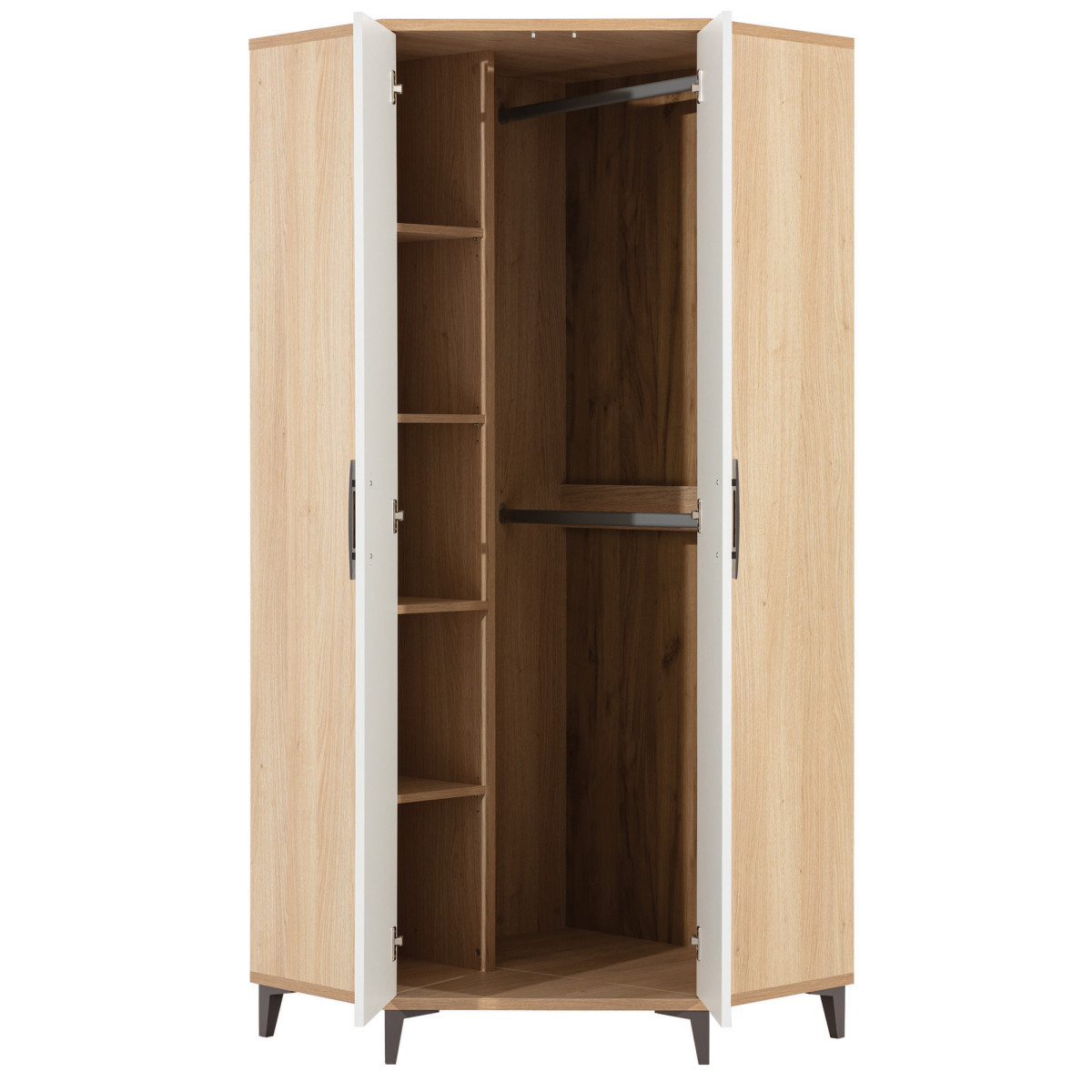 The KUBO KB06 corner wardrobe features two hinged fronts, providing ample storage and organization for everyday items. Inside, shelves are located on the left side, and two clothes rails are located on the right. This corner wardrobe is the perfect way to utilize a less practical corner in any room. The warm colors of the frame and glossy white fronts brighten and visually enlarge the space, adding a cozy feel. Dark legs are an additional advantage, making it easier to maintain order and adding a touch of lightness to the overall look. This corner wardrobe is ideal for use with other pieces from the KUBO series, or as a standalone piece, adapting to your room’s décor.