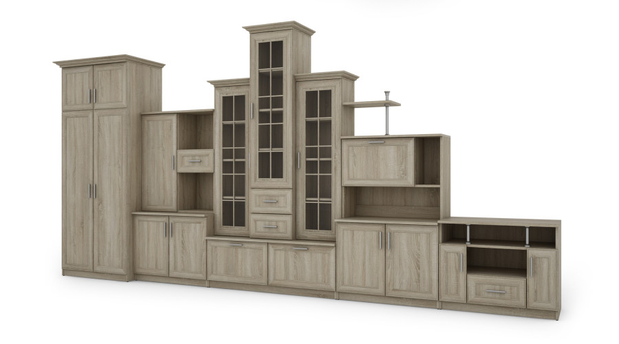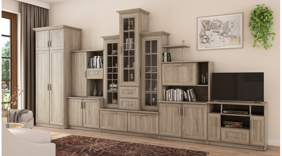 The Light Sonoma color gives the wall unit a lighter and more neutral look. The light wood tone visually brightens the interior and complements both classic and calm, modern interiors, emphasizing the elegant character of a very large unit.