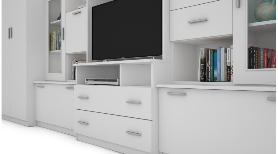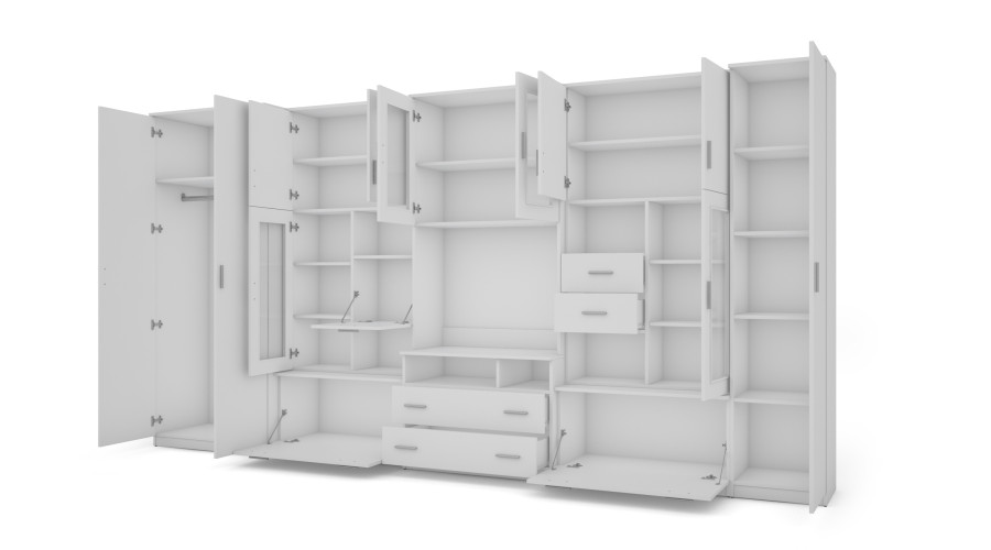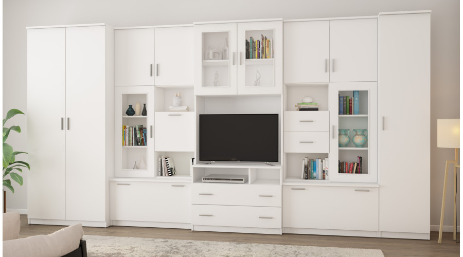 The unit is complemented by lockable cabinets and display units, which clearly separate storage space from the display area. The open layout of selected recesses allows for the display of decorations, books, or multimedia equipment, while maintaining order and cohesion within the overall design. The Arctic White color gives the wall unit a light, neutral character. The light color visually brightens the interior and makes the complex structure appear lighter, fitting well into modern and minimalist interiors.