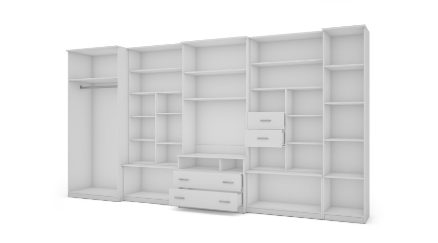 The unit includes a spacious wardrobe with a hanging rail and shelf, as well as a five-shelf wardrobe column that facilitates logical organization of clothing, textiles, and accessories. The central section of the wall unit is designed as a clearly organized TV area with a large recess for a TV and a multimedia cabinet. Drawers located in the lower section provide additional storage for everyday items.