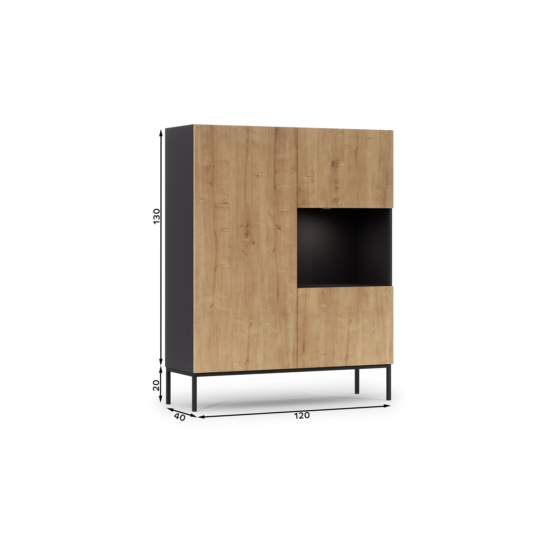 The Lanzzi display cabinet will organize your space while adding a charming touch of style. This is all thanks to its five-shelf design (four closed and one open) and a spacious drawer with a soft-close function. This modern and stylish display cabinet can be used in the living room, bedroom, or hallway. It’s perfect for a study or office, thanks to its numerous closed shelves. Dimensions: 120 x 40 x 150 cm. The display cabinet from the Lanzzi collection by BalduMarket combines a black metal frame with a laminated MDF board, a durable, damage-resistant material that will last for years. Lanzzi display cabinets are available in two styles: black with gold handles or black with an oak-colored front, allowing you to customize the color to your needs. Available in two color options. You can choose between opening/closing the furniture: handles or click system. Height: 150 cm. Depth: 40 cm. Width: 120 cm. Weight: 62 kg. Frame color: black. Material configuration: matt black + artisan oak / matt black + matt black. Material: MDF board. Legs: metal. Leg height: 20 cm. Number of doors: 2. Number of shelves: 5. Number of drawers: 1. Number of open shelves: 1.