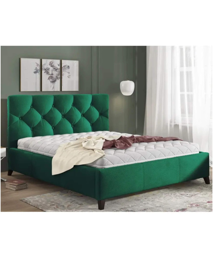 The Kassandra bed, with a sleeping area of 160×200 cm, features a beautifully elegant, quilted, and hand-stitched headboard, featuring a distinctive fish-scale pattern. The classic headboard design makes it a perfect fit for any interior decorated in the same style. The prestigious style of the bedroom is enhanced by upholstery buttons finished with decorative fabric. The set can be expanded with optional elements such as a spacious front-opening bedding container, a mattress base with lifters, or a mattress base without lifters. A wide range of colors, leg types, and upholstery materials are also available. Additional elements and fabric and color samples are available in the product creator.