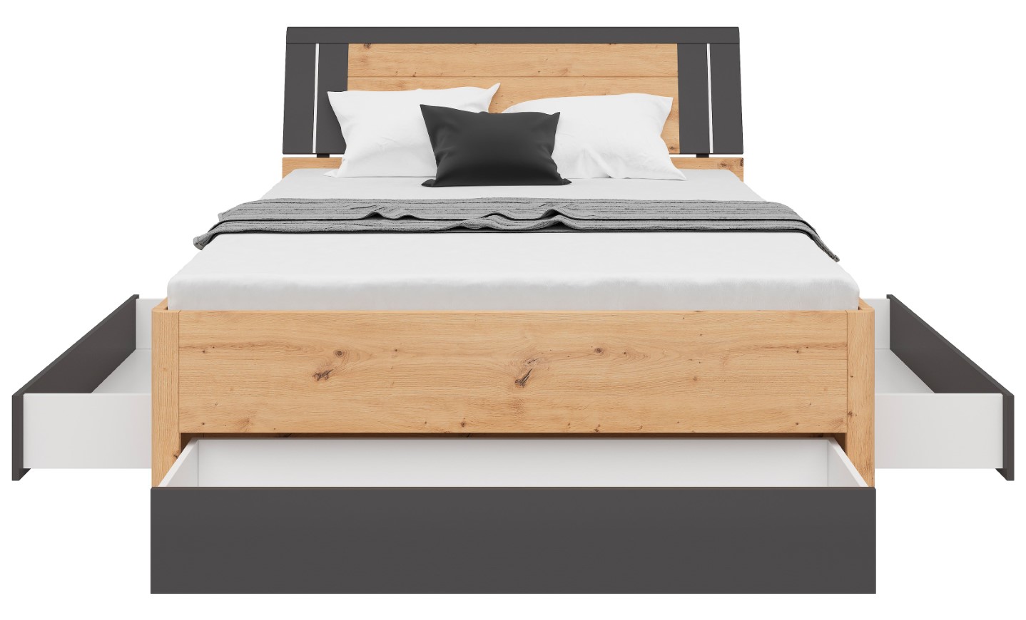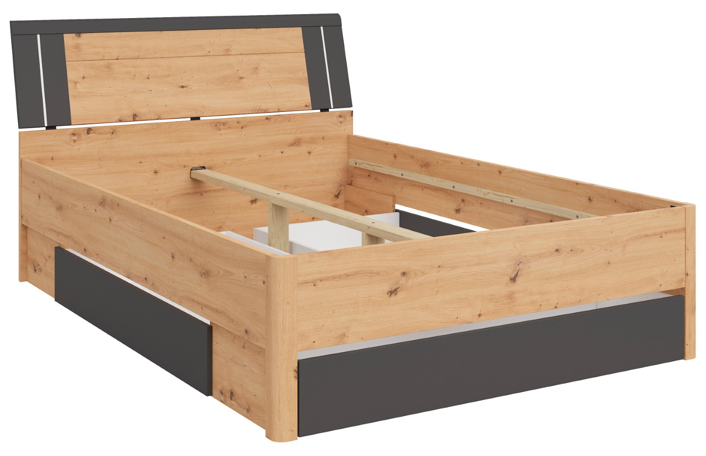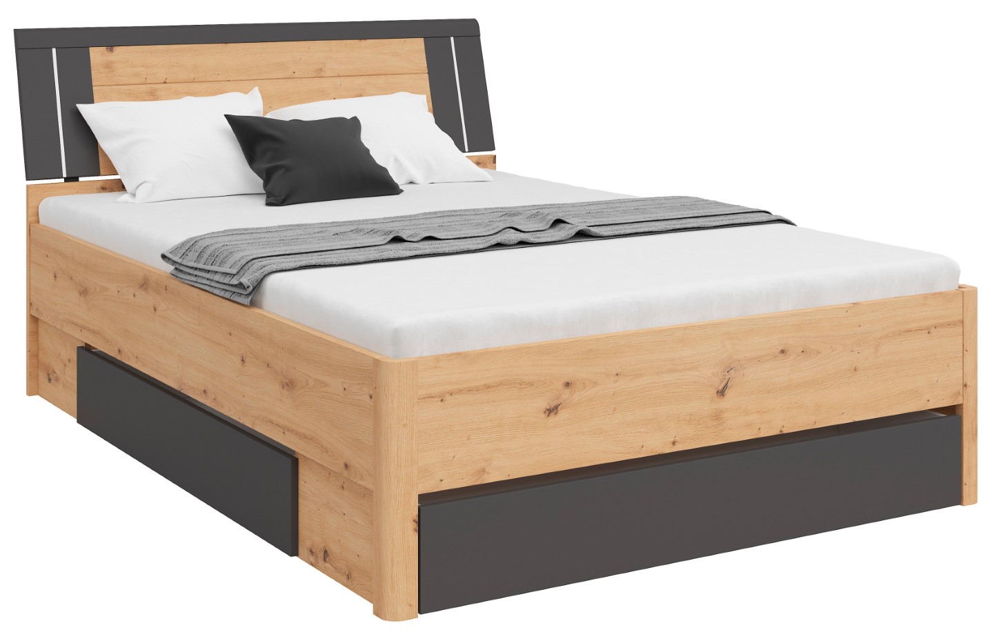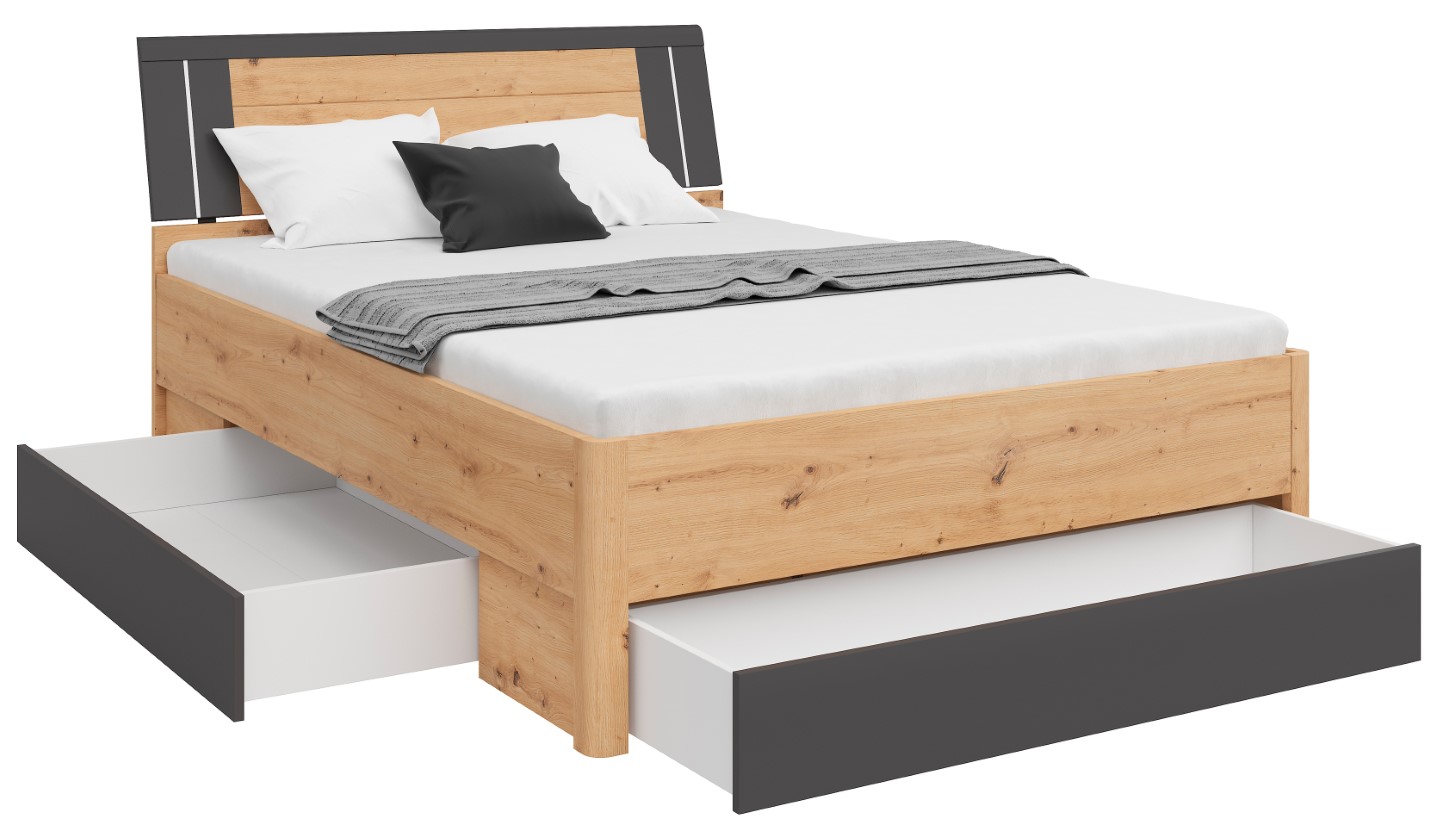 The Saturn 140 Bed – in the Service of Sleep. Sleep is a journey into the depths of our dreams, and the right bed is like a satellite that escorts us on this magical journey every night. The Saturn 140 Bed is not just a place to sleep; it’s a satellite in the service of your sleep, offering not only comfort but also modern design and practical solutions. The bed frame is made of solid 22 mm thick chipboard, ensuring durability and structural stability. The bed front, made of 16 mm thick chipboard, is available in a variety of colors, such as white, matte white/graphite, artisan oak/white, artisan oak/graphite, and dark flagstaff oak/graphite. This allows you to match the bed to your individual preferences and interior style. Three drawers are not only a practical storage solution but also an element that helps keep your bedroom tidy. Thanks to them, everyday items are always within reach, yet hidden away from view. It’s the perfect solution for those who value functionality and aesthetics in one. LED lighting is another advantage of the Saturn bed, giving it a modern and stylish character. The subtle illumination makes the bed not only a place to sleep but also a designer element. This subtle light accompanies you during moments of relaxation and rest. In short, the Saturn 140 Bed is not just a piece of furniture; it’s a satellite serving your sleep, ensuring not only comfort but also aesthetics and functionality. Its modern design, variety of colors, storage drawers, and LED lighting make sleep an unforgettable experience every night. Discover the magical world of sleep with the Saturn 140 Bed!