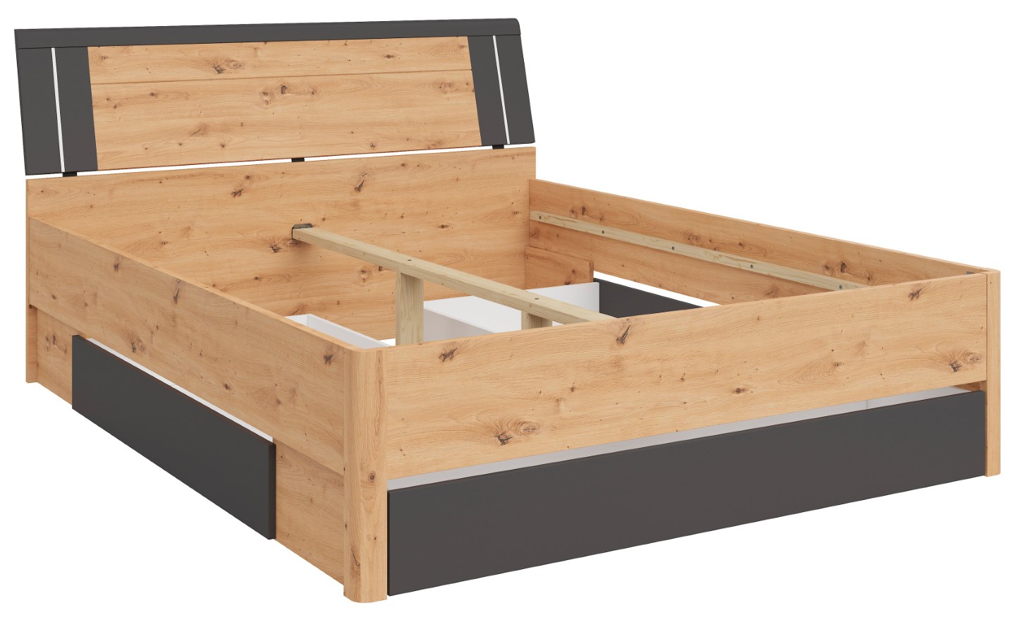 The Saturn 160 Bed – in the Service of Sleep. Sleep is a journey into the depths of our dreams, and the right bed is like a satellite that escorts us on this magical journey every night. The Saturn 160 Bed is not just a place to sleep; it’s a satellite in the service of your sleep, offering not only comfort but also modern design and practical solutions. The bed frame is made of solid 22 mm thick chipboard, ensuring durability and structural stability. The bed front, made of 16 mm thick chipboard, is available in a variety of colors, such as white, matte white/graphite, artisan oak/white, artisan oak/graphite, and dark flagstaff oak/graphite. This allows you to customize the bed to suit your individual preferences and interior style. Three drawers are not only a practical storage solution but also an element that helps keep your bedroom tidy. Thanks to them, everyday essentials are always within reach, yet tucked away out of sight. It’s the perfect solution for those who value functionality and aesthetics in one. LED lighting is another advantage of the Saturn bed, giving it a modern and stylish character. The subtle illumination makes the bed not only a place to sleep but also a designer element. This subtle light accompanies you during moments of relaxation and rest. In short, the Saturn 160 Bed is not just a piece of furniture; it’s a satellite serving your sleep, ensuring not only comfort but also aesthetics and functionality. Its modern design, variety of colors, storage drawers, and LED lighting make sleep an unforgettable experience every night. Discover the magical world of sleep with the Saturn 160 Bed!