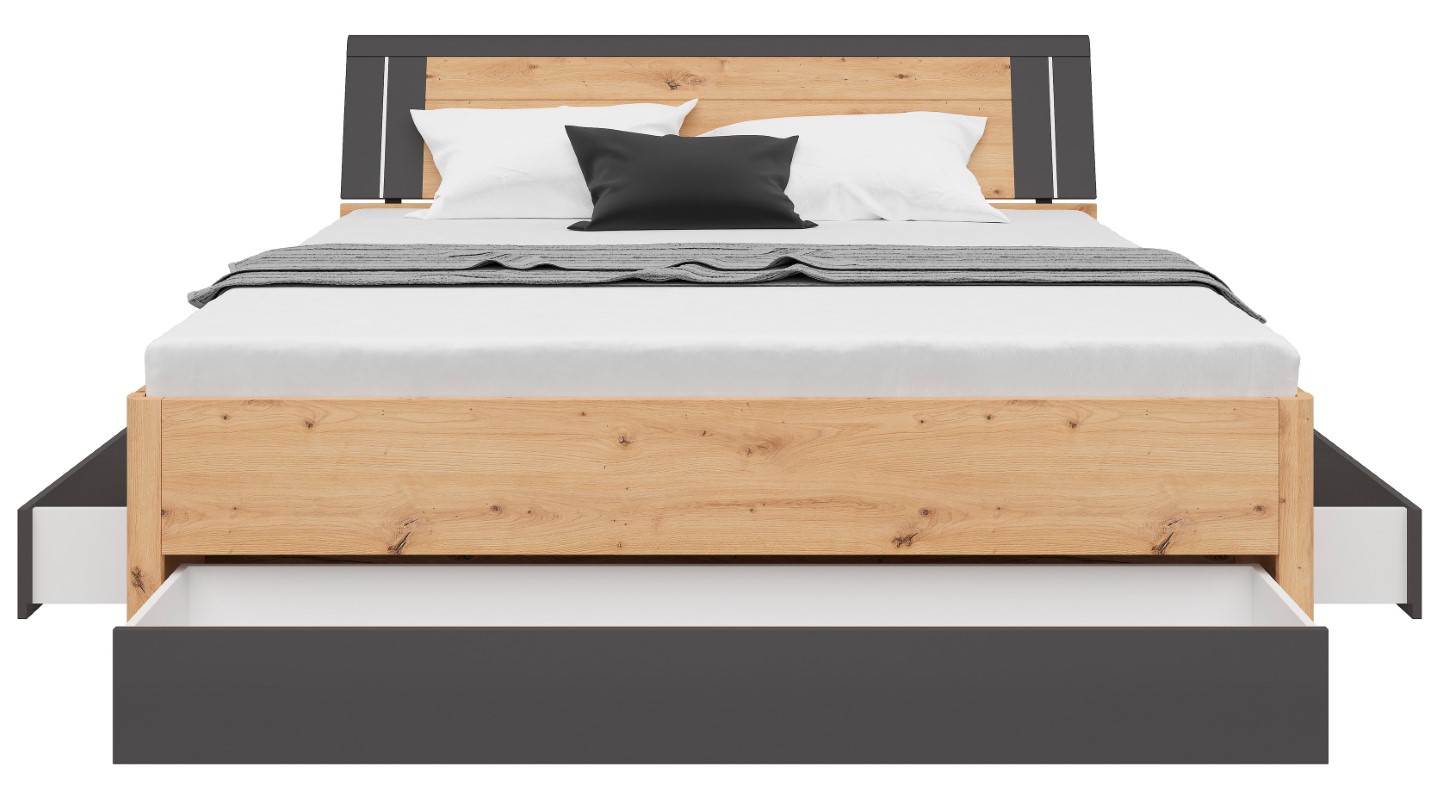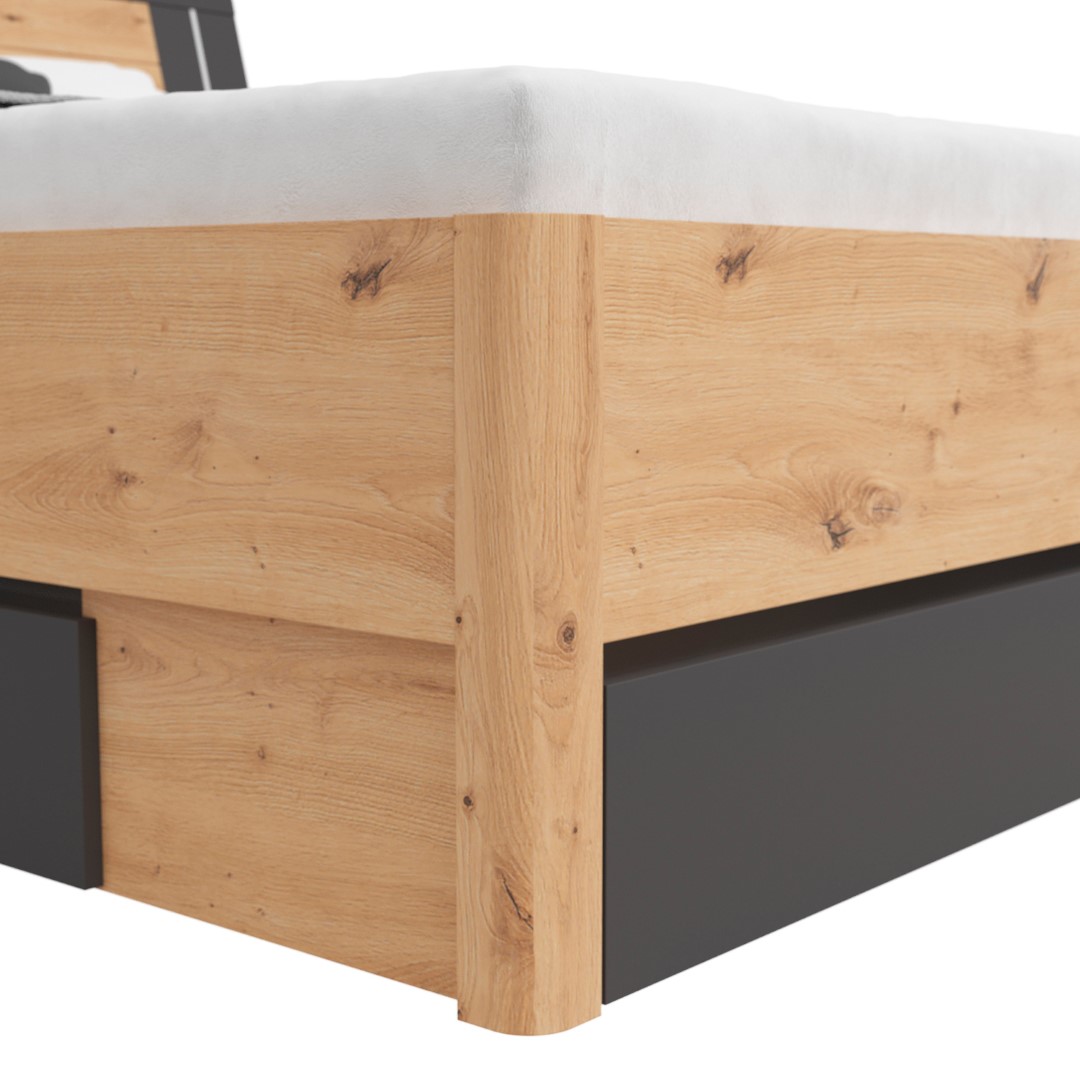 The Saturn 180 Bed – Good for Your Sleep. Sleep is a journey into the depths of our dreams, and the right bed is like a satellite that escorts us on this magical journey every night. The Saturn 180 Bed is not just a place to sleep; it’s a satellite serving your sleep, offering not only comfort but also modern design and practical solutions. The bed frame is made of solid 22 mm thick chipboard, ensuring durability and structural stability. The bed front, made of 16 mm thick chipboard, is available in a variety of colors, such as white, matte white/graphite, artisan oak/white, artisan oak/graphite, and dark flagstaff oak/graphite. This allows you to customize the bed to suit your individual preferences and interior style. Three drawers are not only a practical storage solution but also an element that helps keep your bedroom tidy. Thanks to them, everyday essentials are always within reach, yet tucked away out of sight. It’s the perfect solution for those who value functionality and aesthetics in one. LED lighting is another advantage of the Saturn bed, giving it a modern and stylish character. The subtle illumination makes the bed not only a place to sleep but also a designer element. This subtle light accompanies you during moments of relaxation and rest. In short, the Saturn 180 Bed is not just a piece of furniture for sleeping; it’s a satellite at the service of your sleep, ensuring not only comfort but also aesthetics and functionality. Its modern design, variety of colors, storage drawers, and LED lighting make sleep an unforgettable experience every night. Discover the magical world of sleep with the Saturn 180 Bed!
